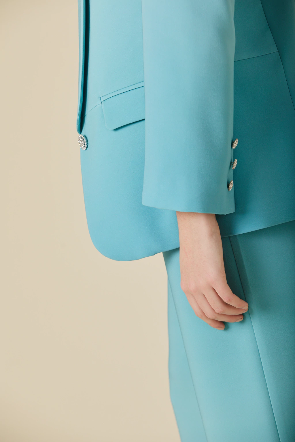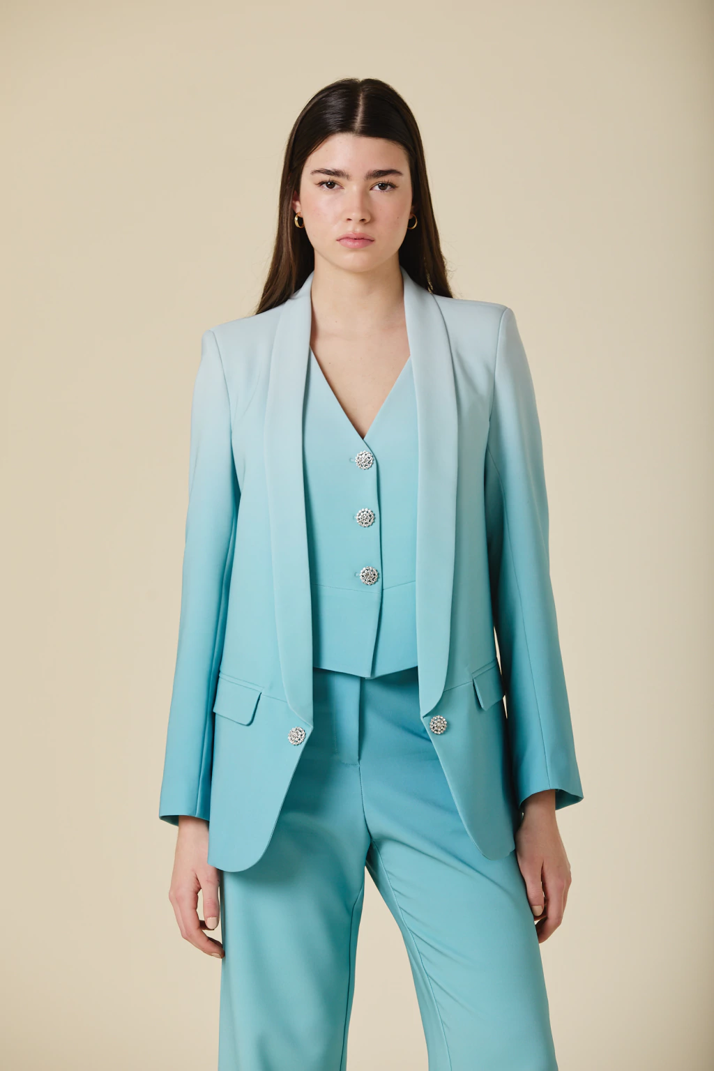 Este saco smoking de crepe sastrero con estampa degradé es una pieza sofisticada que combina estructura y estilo. Su diseño entallado resalta la silueta, mientras que los botones de strass añaden un toque de brillo sutil y elegante. Perfecto para elevar cualquier look con distinción y modernidad.