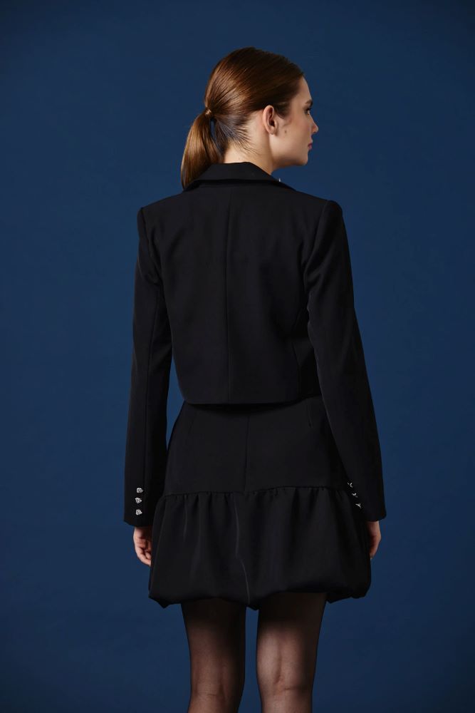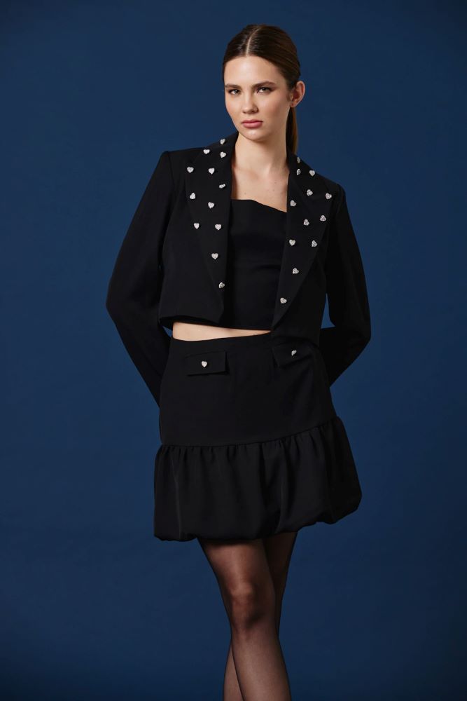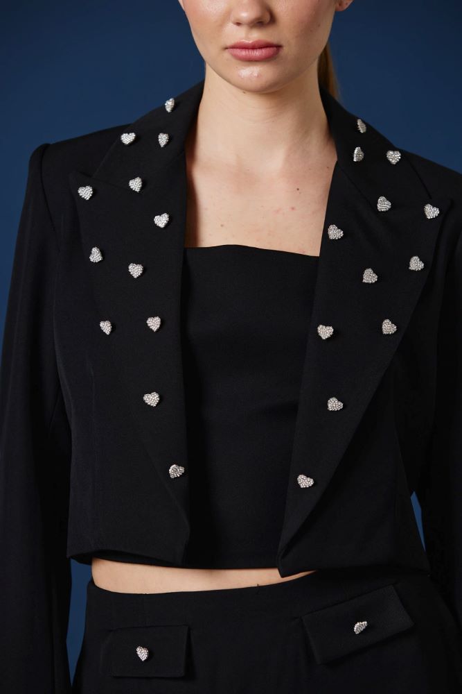 Este spencer de corte sastrero suma un guiño lúdico y brillante a una silueta clásica. Los apliques de corazones de strass aportan luz y personalidad, transformándolo en una pieza protagonista que eleva cualquier look. Su largo reducido y calce entallado estilizan la figura, ideal para llevar sobre vestidos o combinado con pantalones de tiro alto para un conjunto moderno y expresivo.
