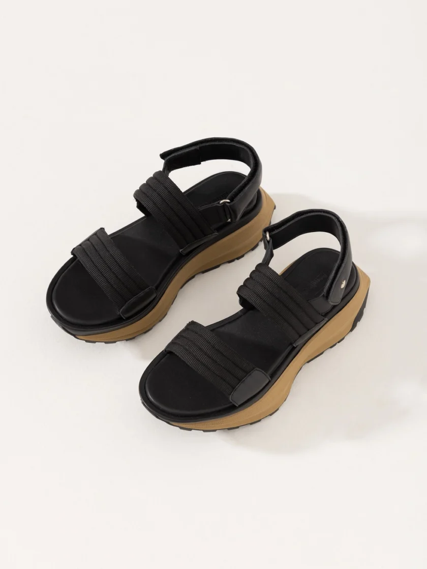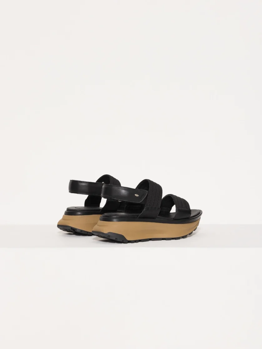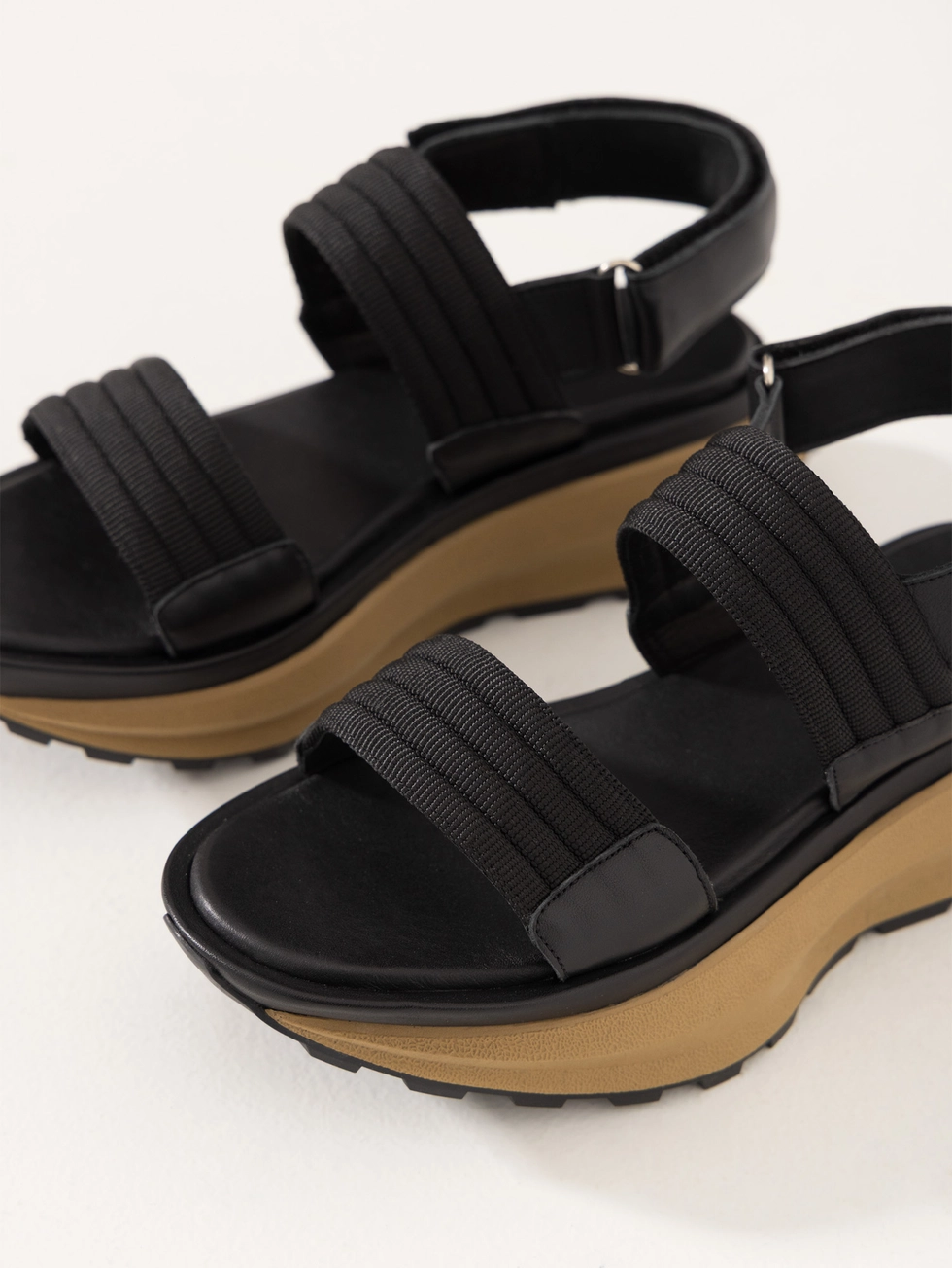 Sandalia Isla de taco alto, combinada en cinta acanalada y cuero vacuno. Lleva un delicado aplique mini Lipstick en el lateral, que la convierte en un diseño distintivo de la colección. Su acceso es práctico gracias a la tira de velcro que asegura el calce. Moderna y cómoda, perfecta para elevar cualquier look.