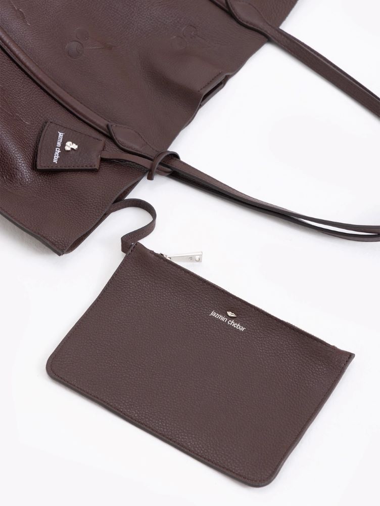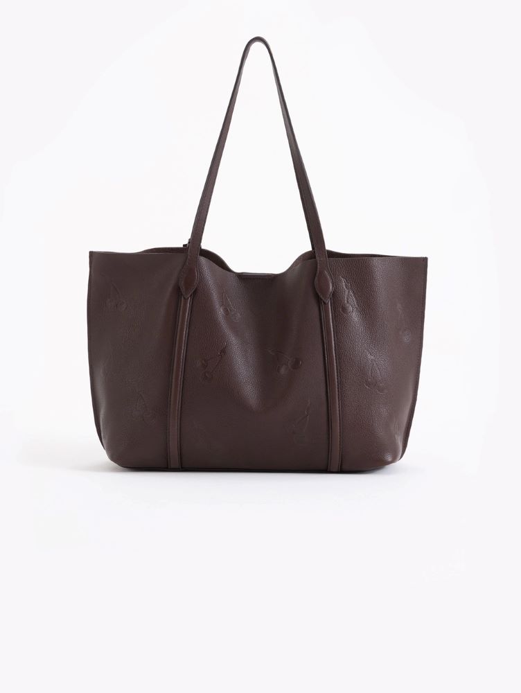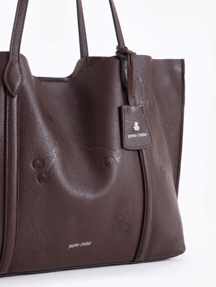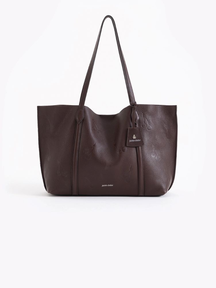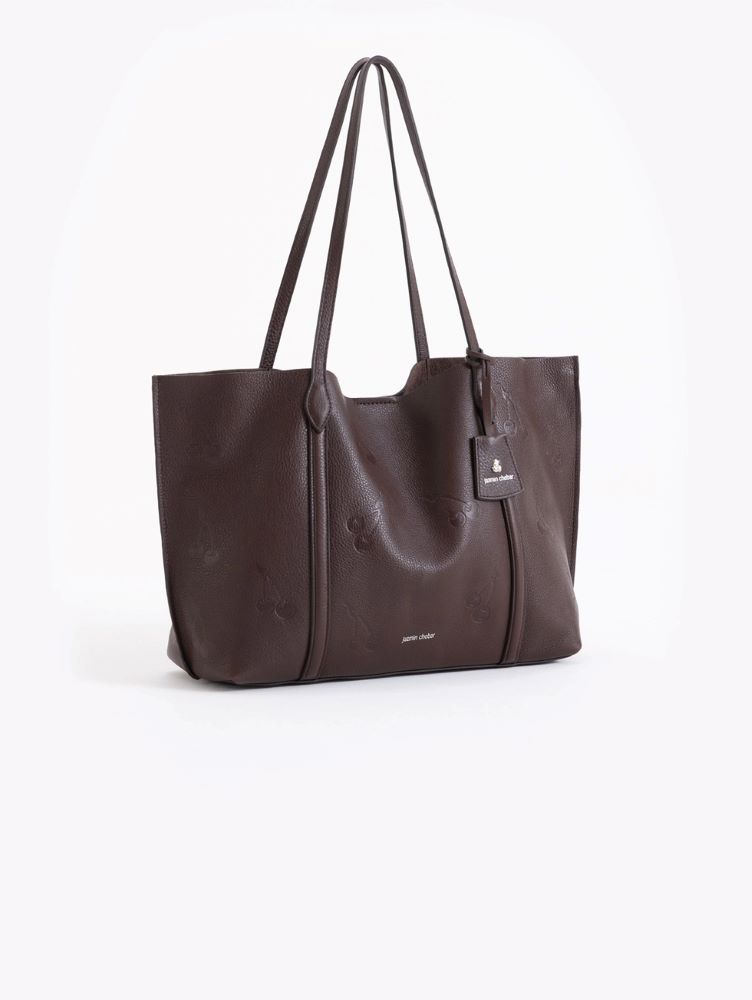 Shopper Cherry Fire realizada en cuero vacuno flor, con grabados de Cherry Fire distribuidos en la superficie. El acceso es mediante imán y en su interior incluye un bolsillo desmontable con cierre metálico. Detalle de tag con mini aplique Cherry Fire.