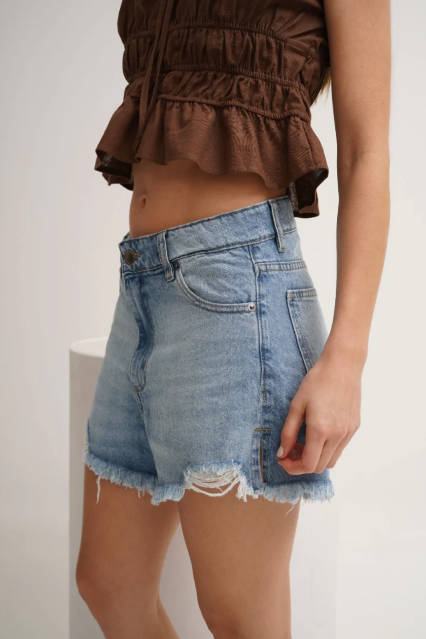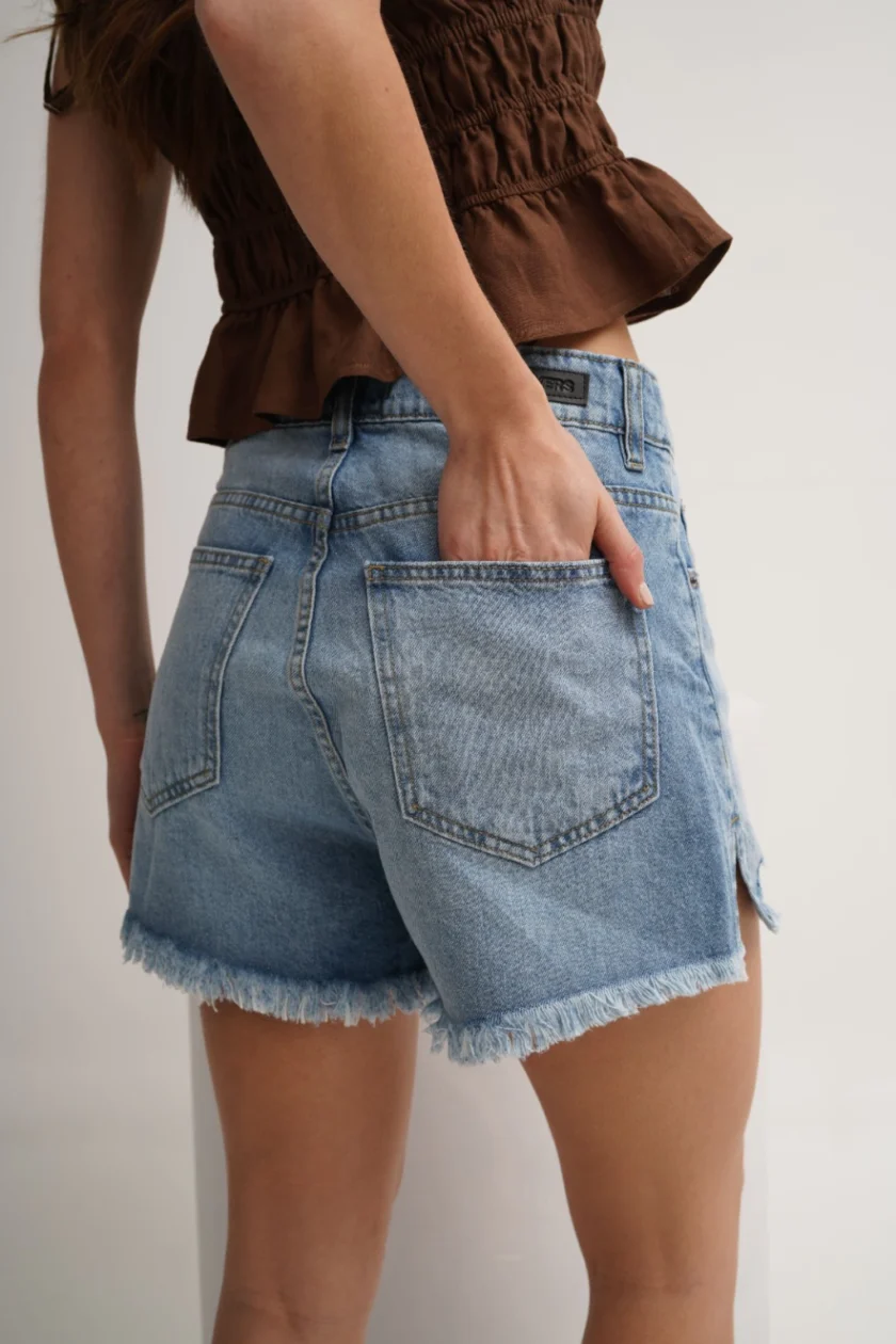 Short tiro medio, suelto en las piernas, con 5 bolsillos y ruedo con roturas y desflecado.