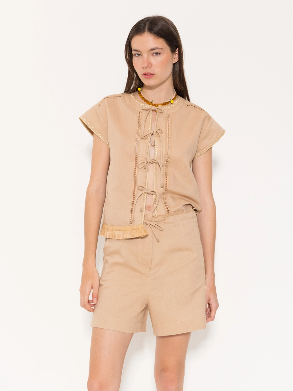 Short Madrid confeccionado en lino. En los laterales lleva recorte con bordado tipo crochet de hilo al tono. Su acceso es a través de cierre metálico al tono. En delantero lleva un cordón tubular de tela base para anudar.