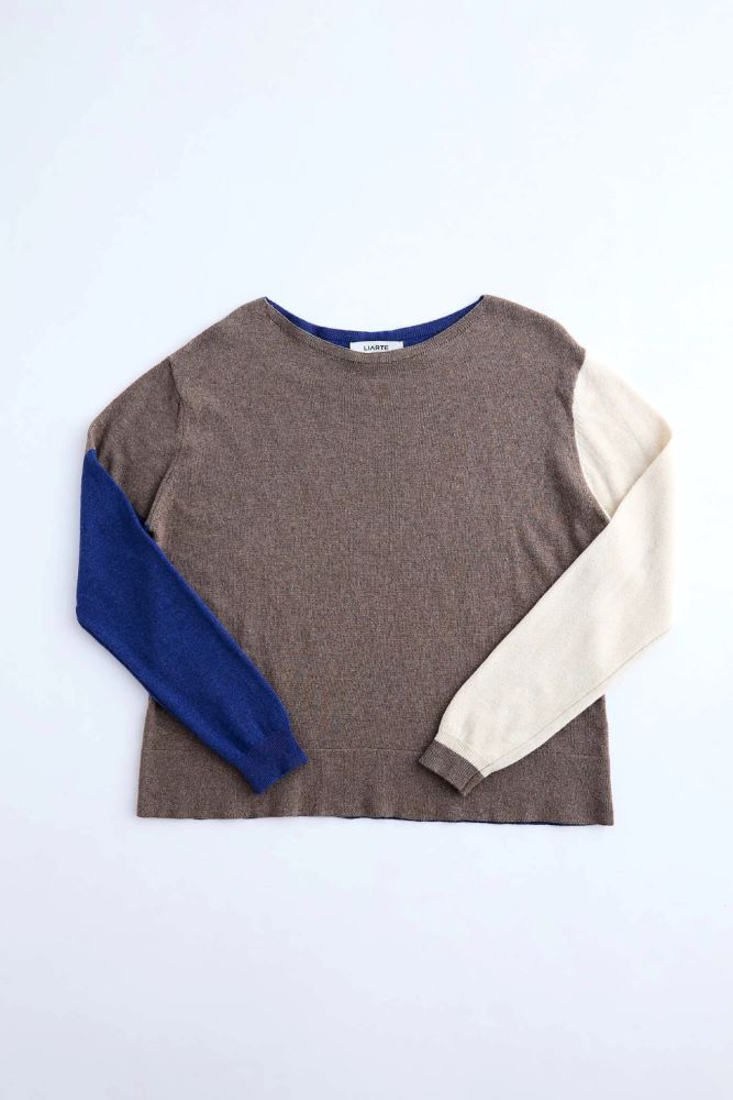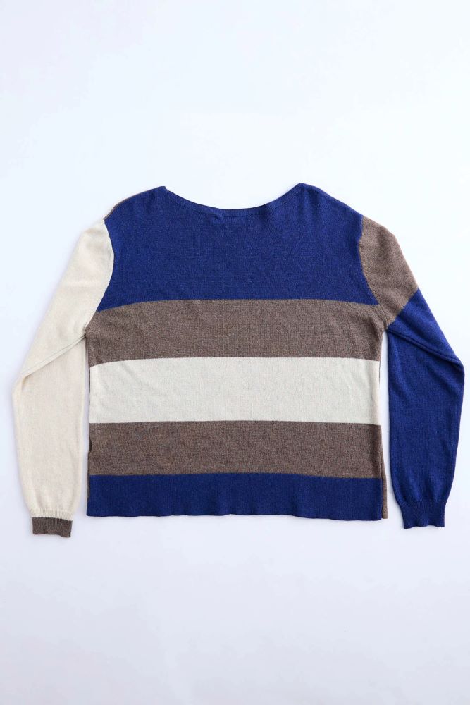 Sweater tejido de silueta amplia, recta y manga caída. Escote redondo semi bote. Presenta una combinación de color block y rayas súper sofisticada y canchera.