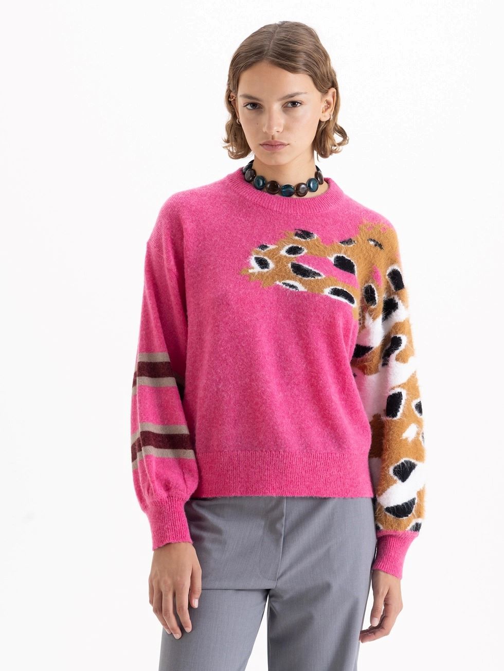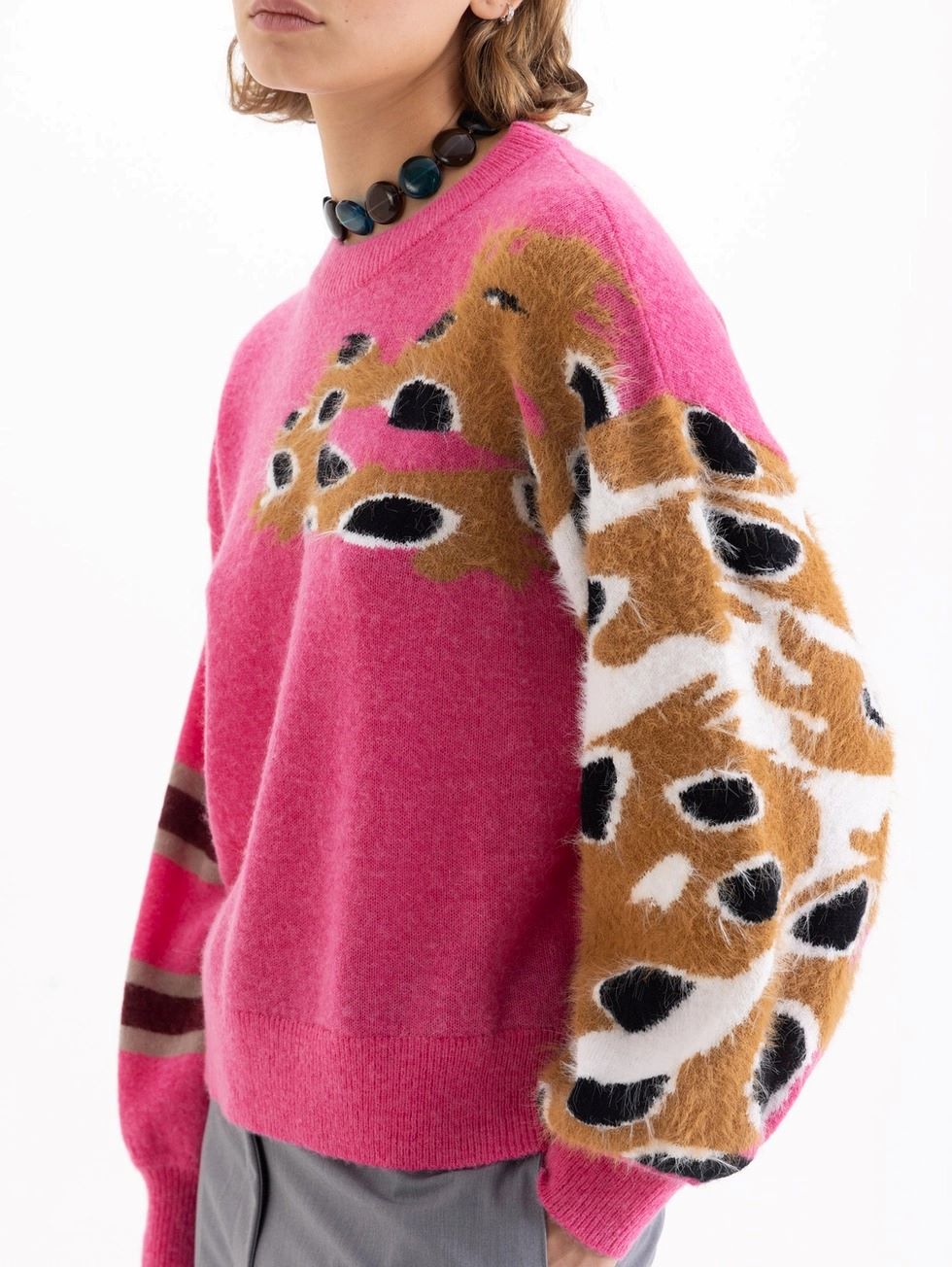 Sweater Dragones tejido en hilado con pelo, que aporta suavidad y textura. Presenta un diseño en el frente y en una de las mangas.