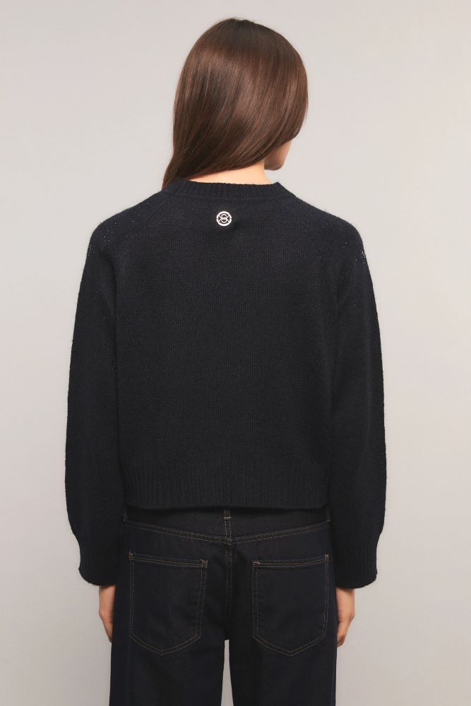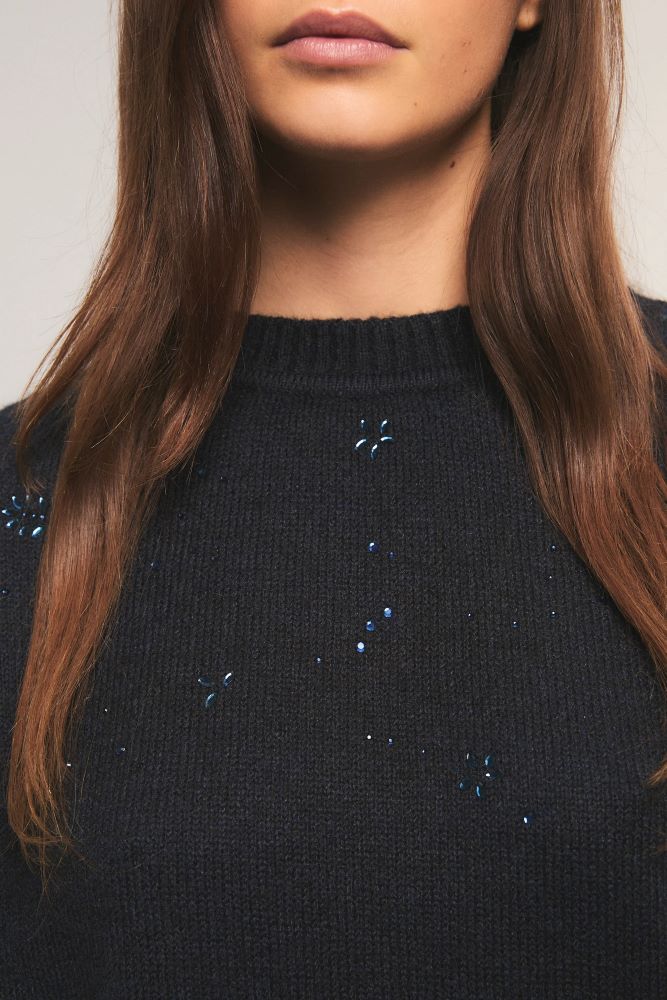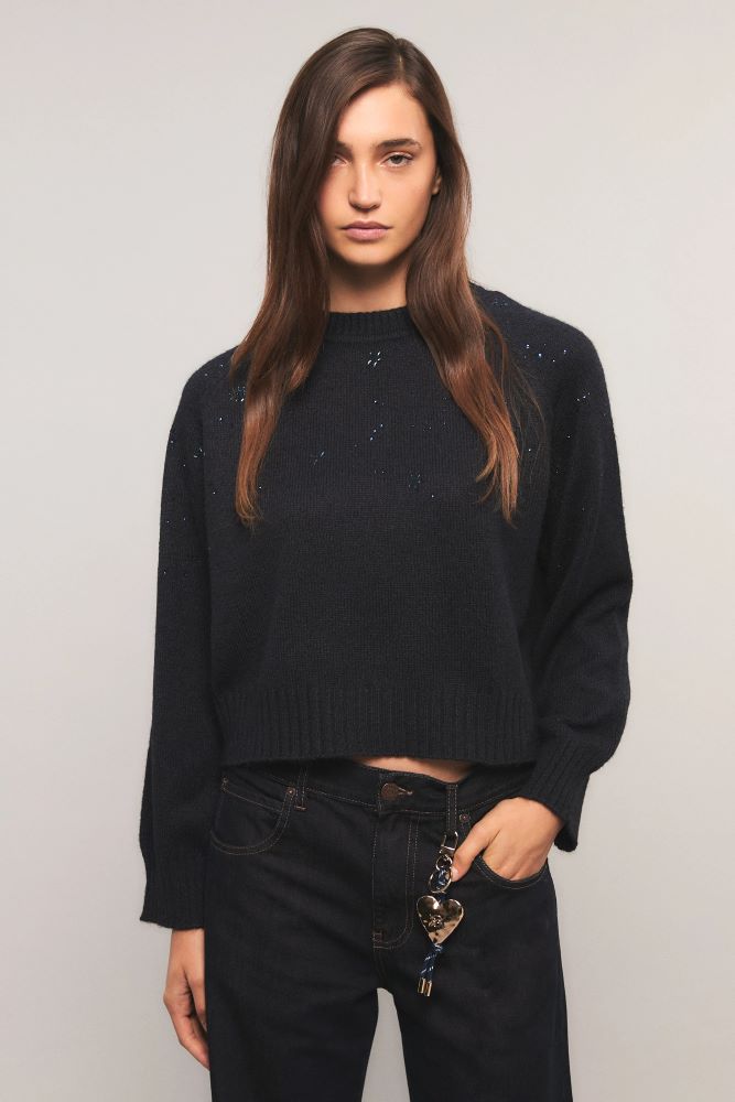 El sweater Feral tiene calce regular, escote redondo y mangas raglán. Tejido en jersey con detalles menguados y terminaciones en rib. La prenda está personalizada con delicados cristales en el delantero y en mangas. Inés está usando en la prenda superior un talle S, y en la prenda inferior un talle S/26. Sus medidas son: Altura 1.75 m. Busto 75 cm. Cintura 65cm. Cadera 90cm