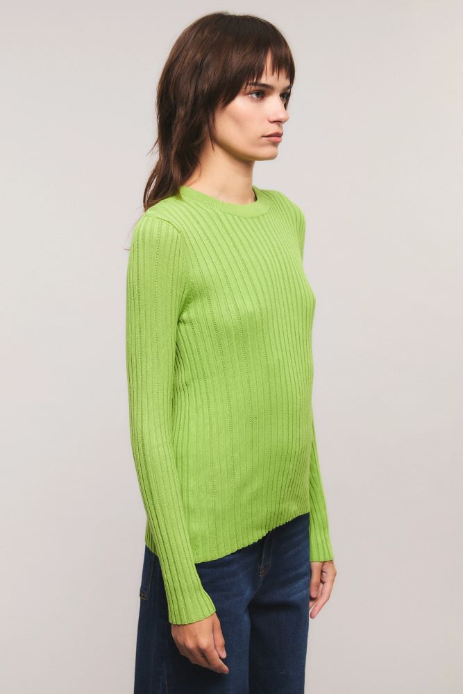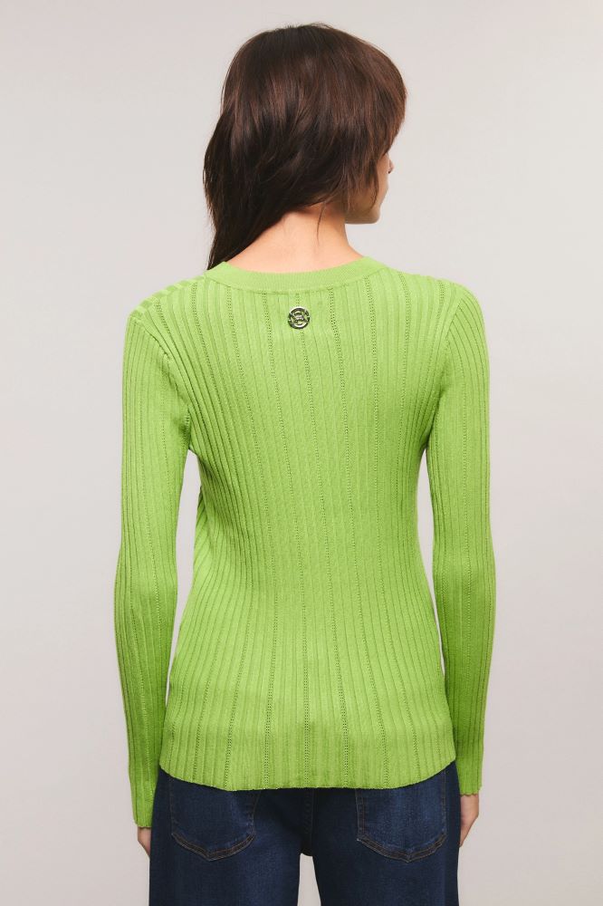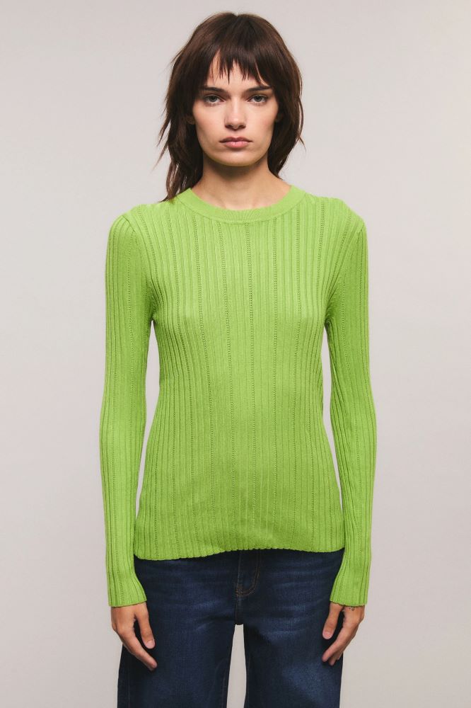 El sweater Fondness tiene calce slim con cuello redondo y manga larga. Está tejido en morley con detalles de calados en toda la prenda. Miranda está usando en la prenda superior un talle S, y en la prenda inferior un talle S/26. Sus medidas son: Altura 1.73 m. Busto 77 cm. Cintura 59cm. Cadera 85cm.