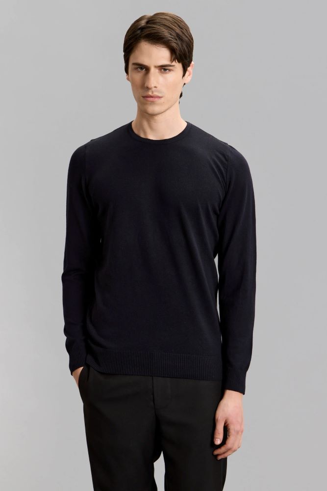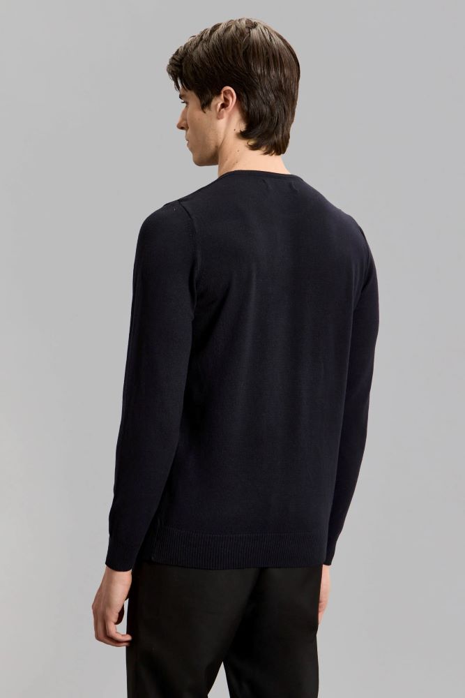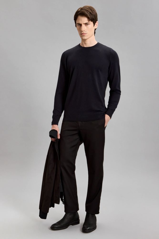El sweater garage road 01 de calce slim fit confeccionado 100% en algodón. Líneas rectas, cuello redondo, generando un aspecto sobrio y versátil. Nacho está usando en la prenda superior un talle M, y en la prenda inferior un talle S/30. Su altura es de 1.85 m.