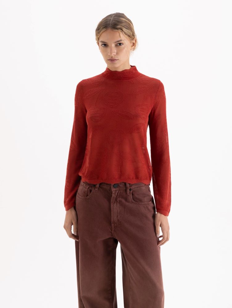 Sweater Kers de cuello media polera y mangas largas, confeccionado en un tejido liviano y suave que combina lana y rayón para una caída impecable. Se destaca por su trama con relieve en el mismo tono, aportando textura a la prenda.