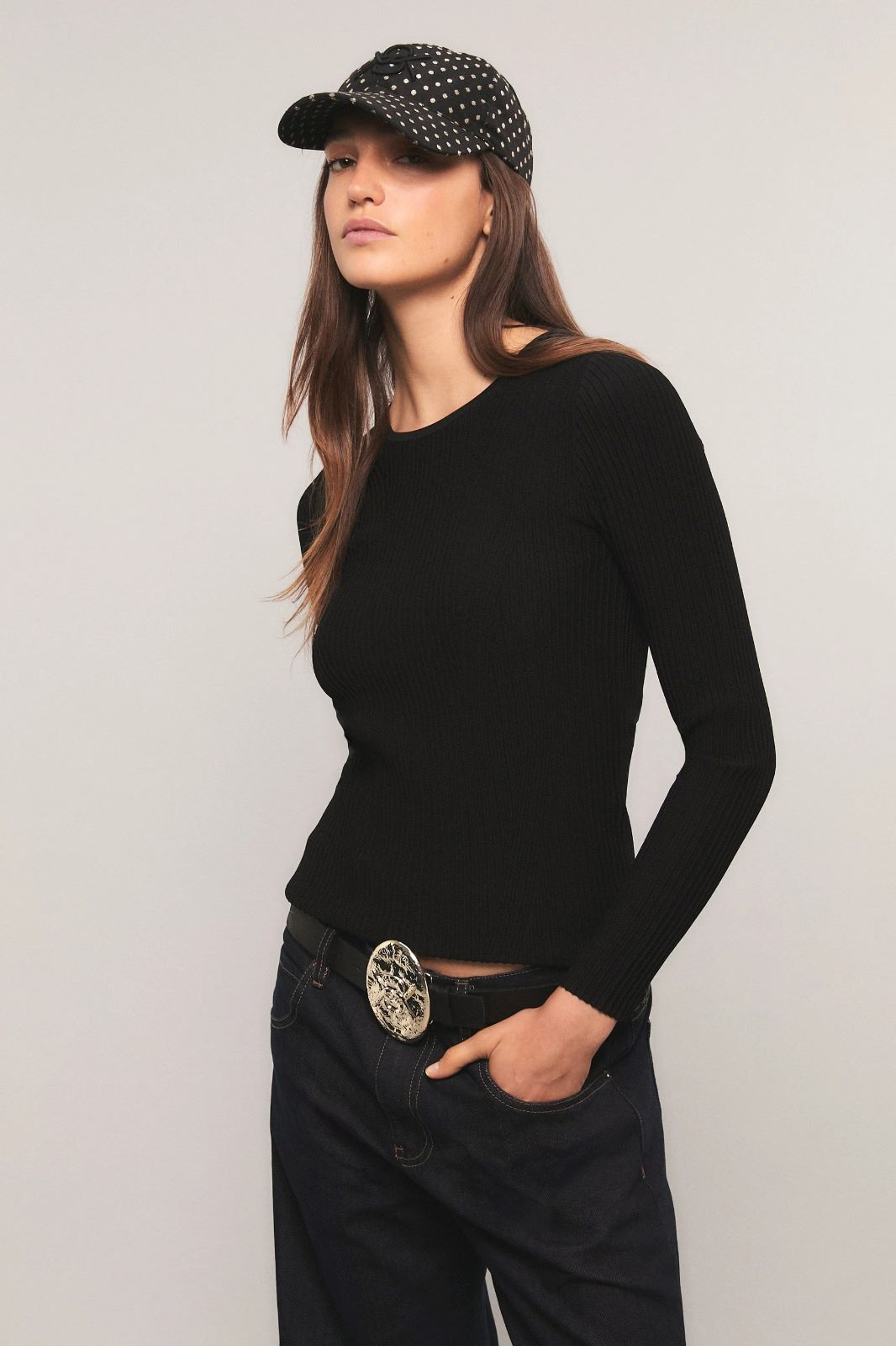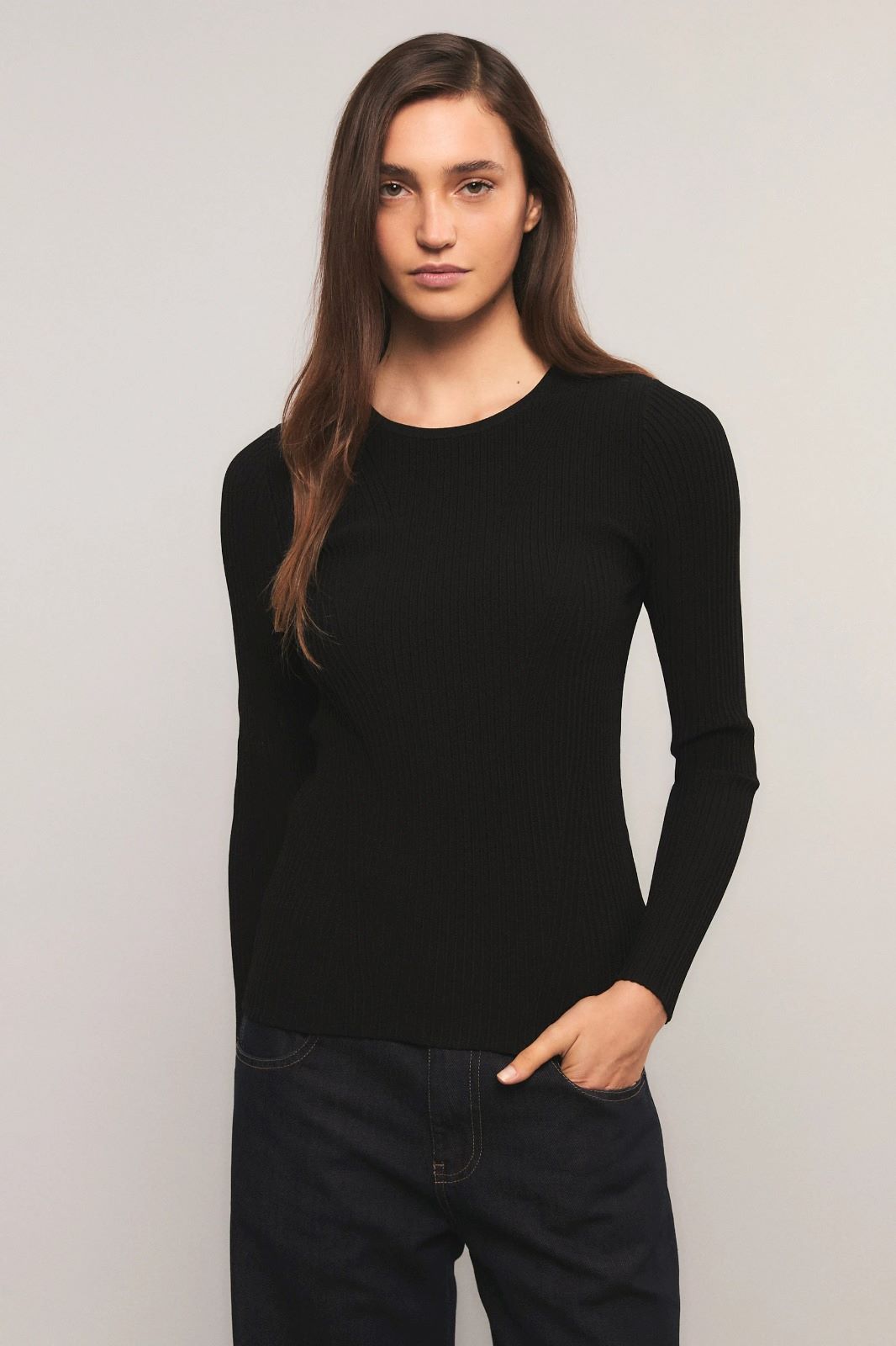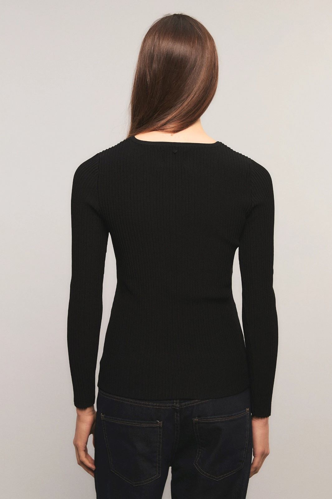 El sweater Pulse presenta un calce slim, con cuello redondo a la base y mangas largas. Está tejido en un punto diferencial que incorpora un sutil diseño en el delantero. Inés está usando en la prenda superior un talle S, y en la prenda inferior un talle S/26. Sus medidas son: Altura 1.75 m. Busto 75 cm. Cintura 65cm. Cadera 90cm.