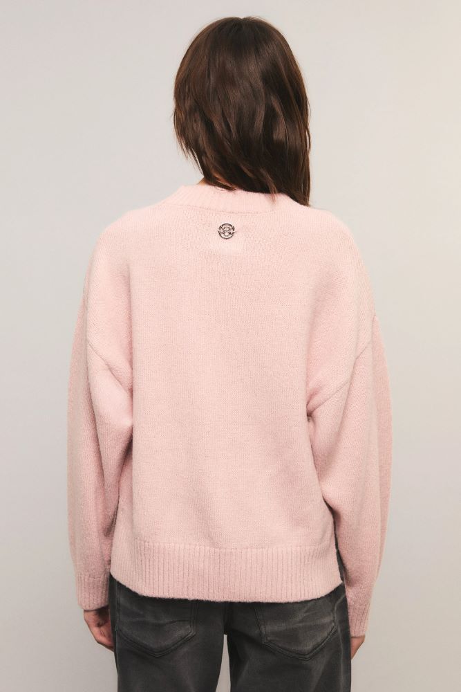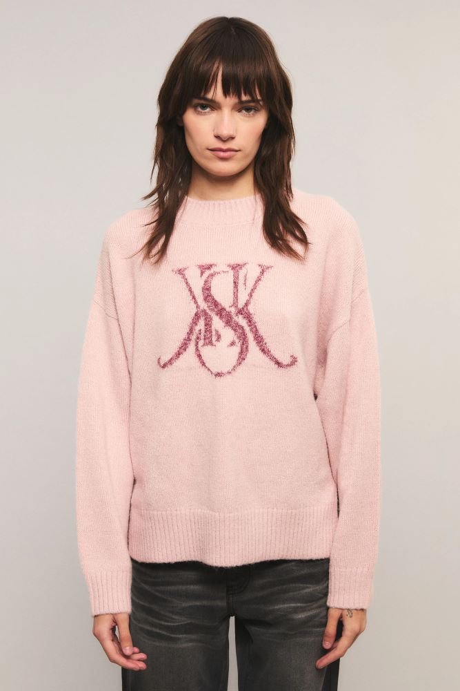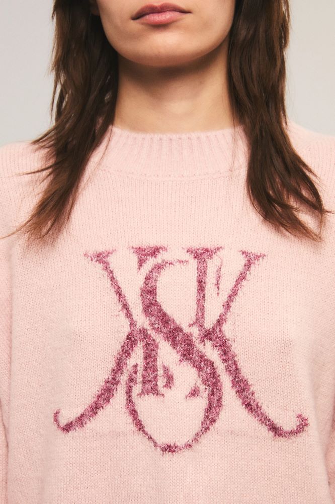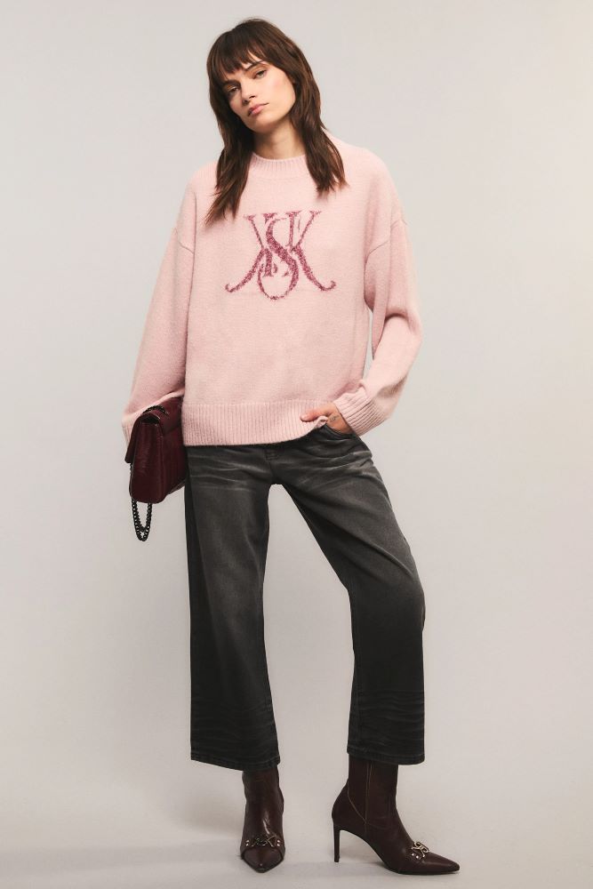 El sweater Reloaded tiene un calce relajado, con cuello redondo, hombros caídos y tajos laterales. Está tejido en jersey y presenta un detalle de jacquard en el delantero, con hilado texturizado y lúrex. Miranda está usando en la prenda superior un talle S, y en la prenda inferior un talle S/26. Sus medidas son: Altura 1.73 m. Busto 77 cm. Cintura 59cm. Cadera 85cm.