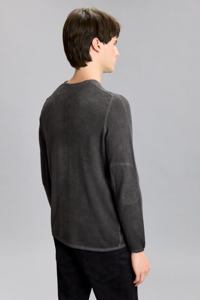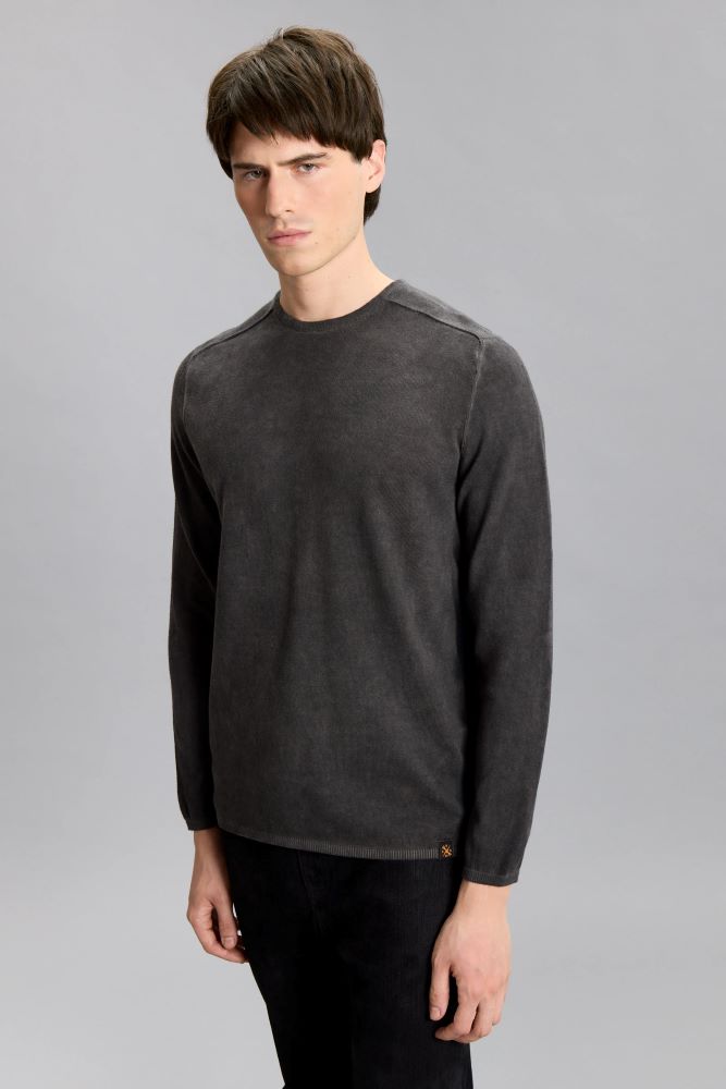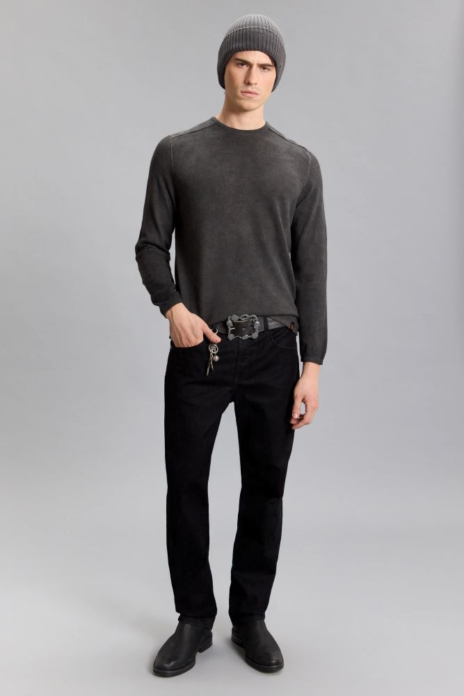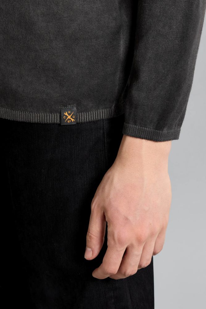 Sweater stone HCG de calce slim fit confeccionado 100% en algodón, con lavado stonewash. Cuello redondo, costuras visibles y badana con el logo de la marca. Nacho está usando en la prenda superior un talle M, y en la prenda inferior un talle S/30. Su altura es de 1.85 m.