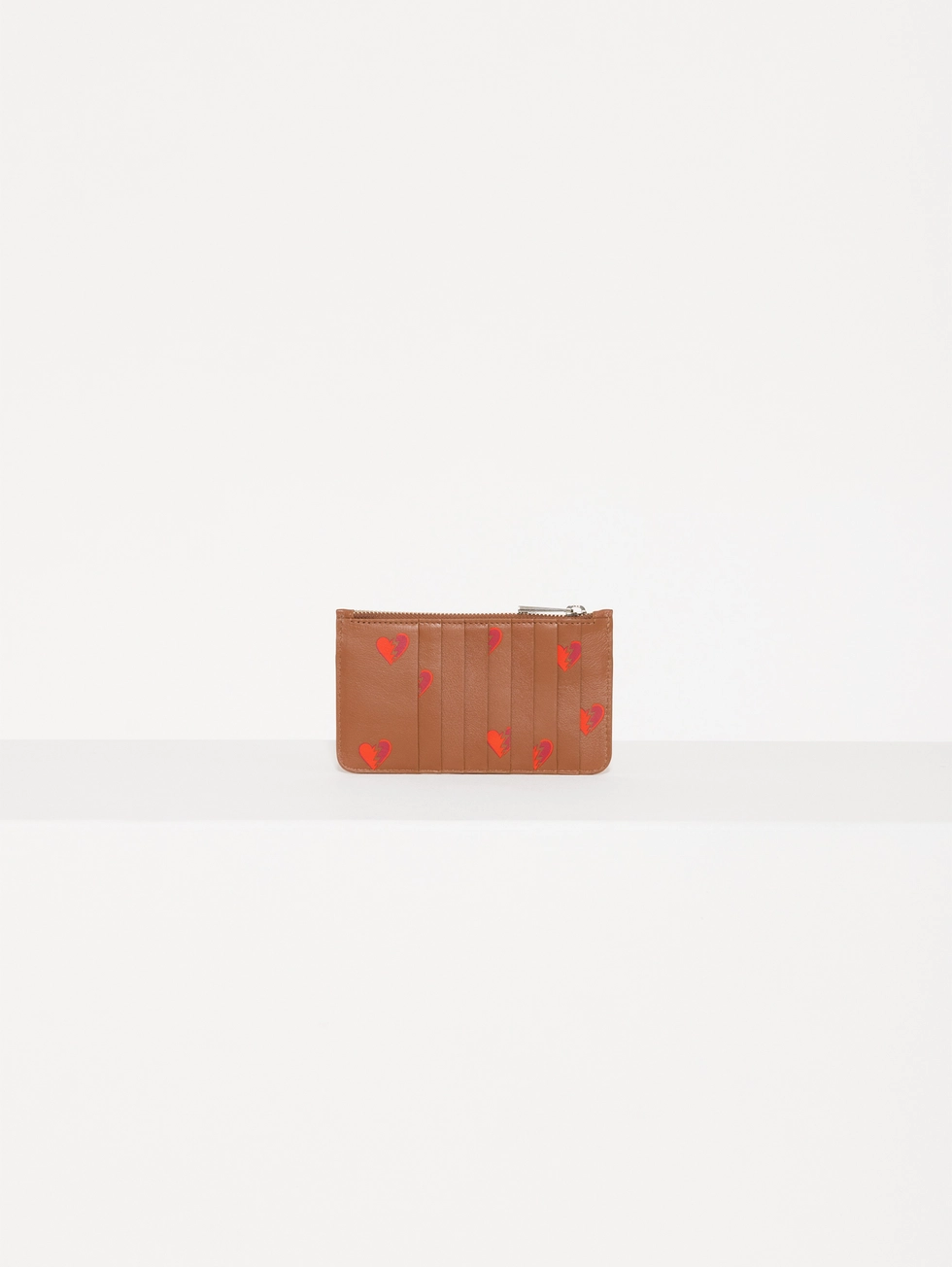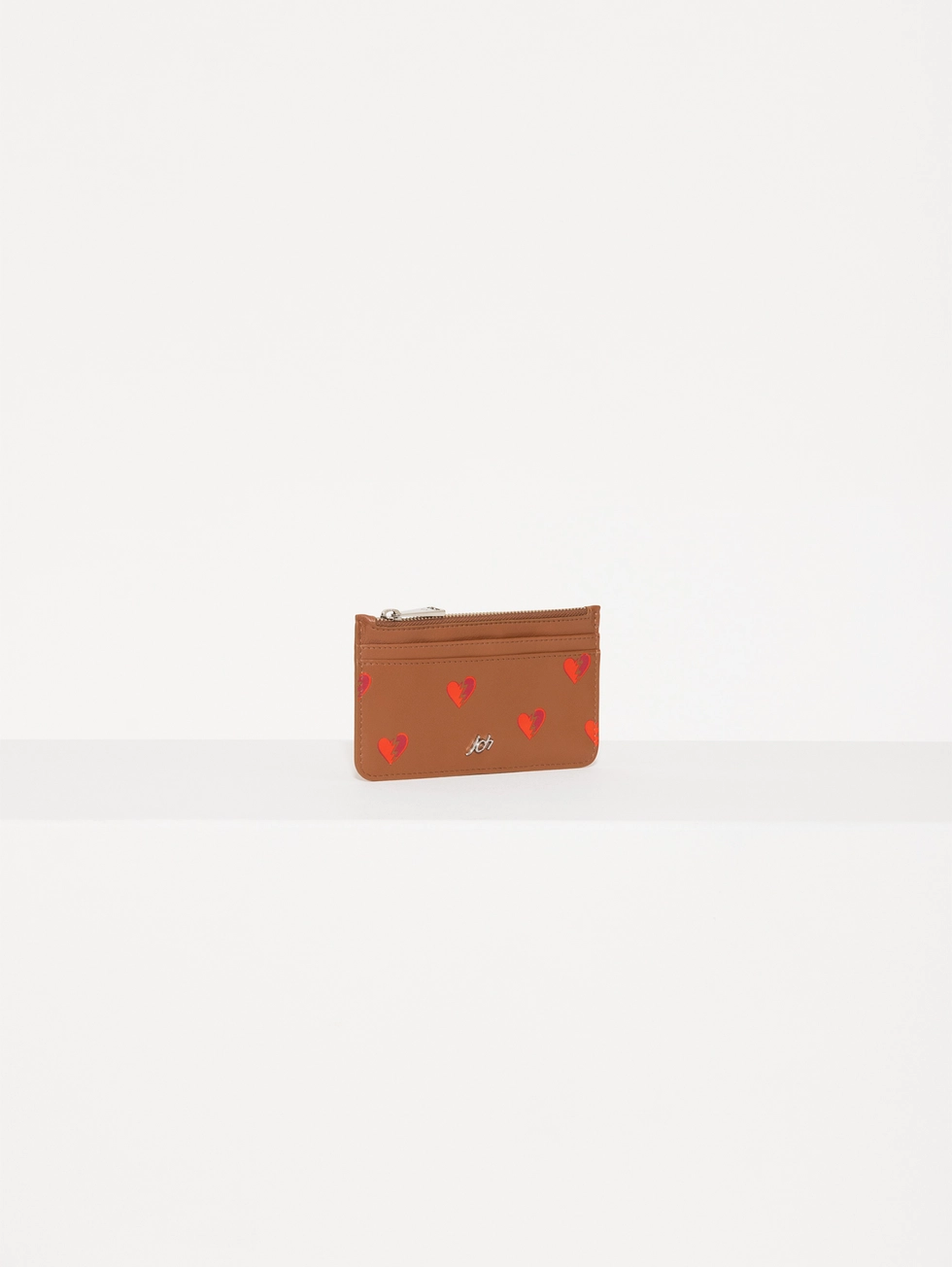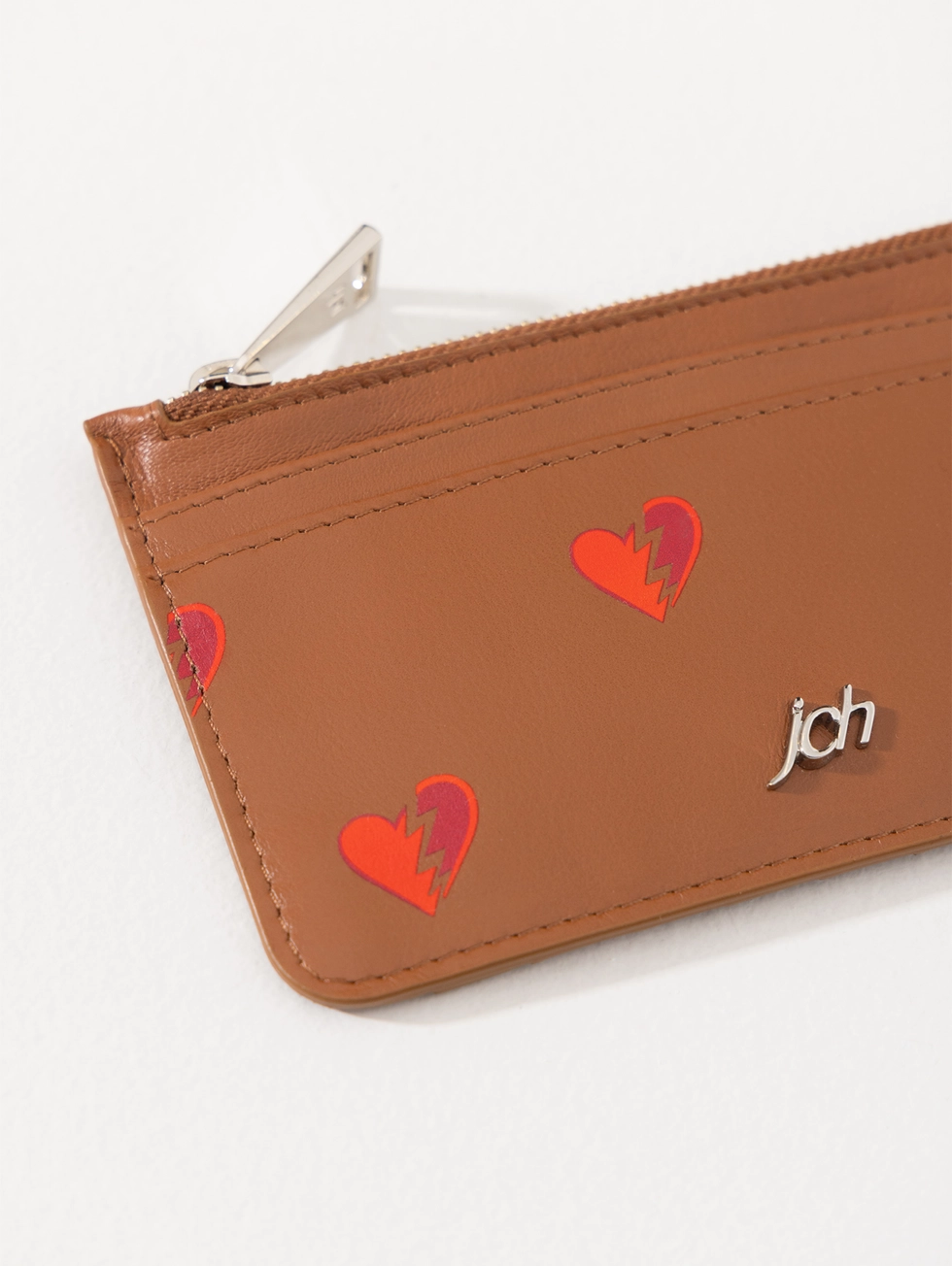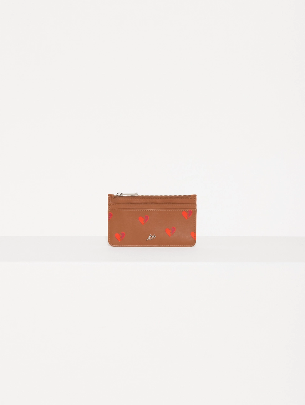 Tarjetero Hearts confeccionado en cuero vacuno liso con estampa Hearts. Cuenta con bolsillo con cierre metálico, espacio para tarjetas y detalle de aplique metálico JCH en el frente.