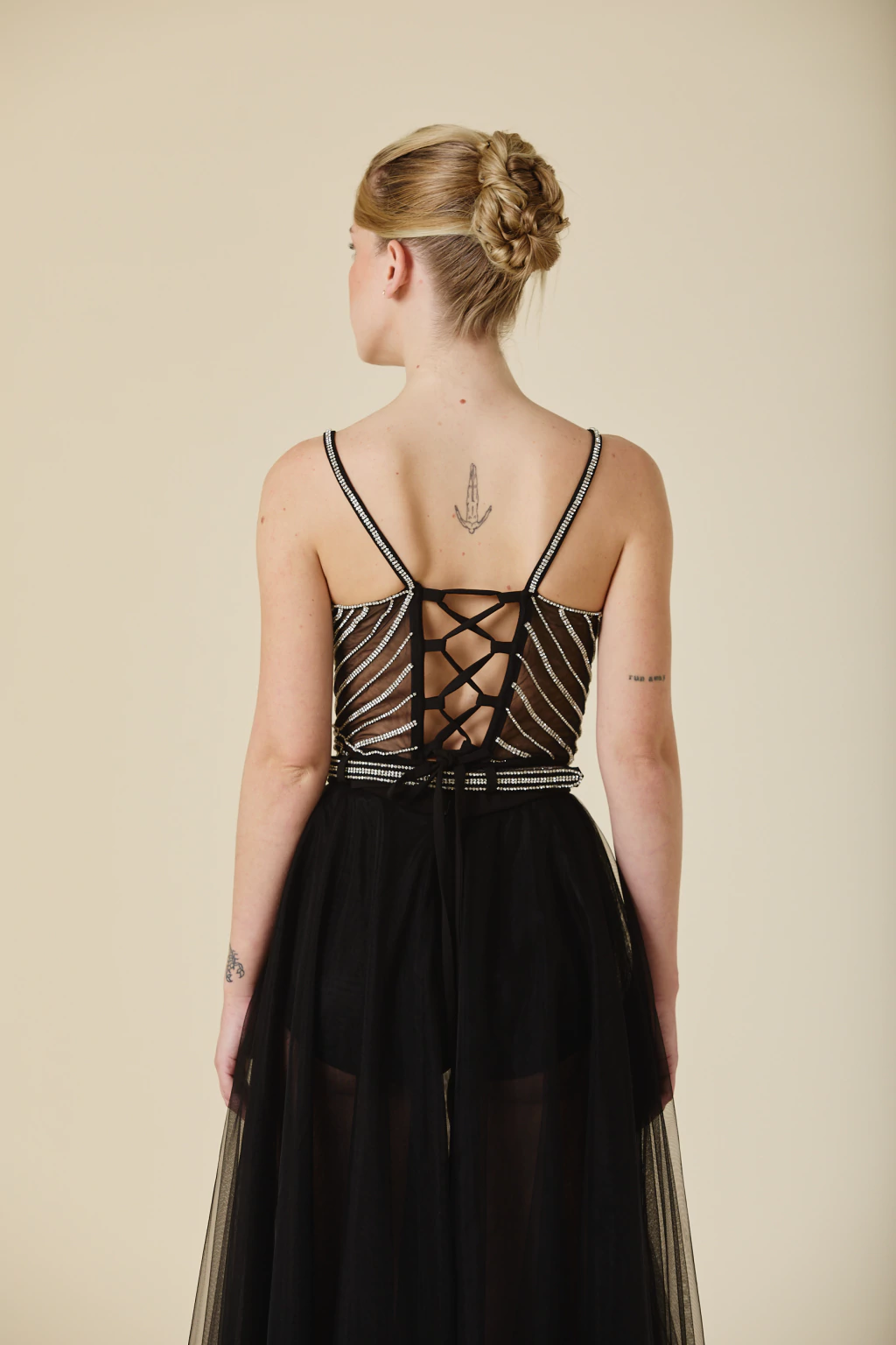 Brillo sutil, impacto asegurado. Este top de tul bordado se destaca por su trabajo artesanal de lentejuelas en diagonales, realzando el escote con líneas que dibujan la figura. El detalle de espalda en crepe aporta estructura, y el pequeño recorte frontal insinúa con delicadeza. Una prenda ideal para elevar conjuntos de noche o eventos especiales, con un equilibrio justo entre romanticismo y diseño contemporáneo.