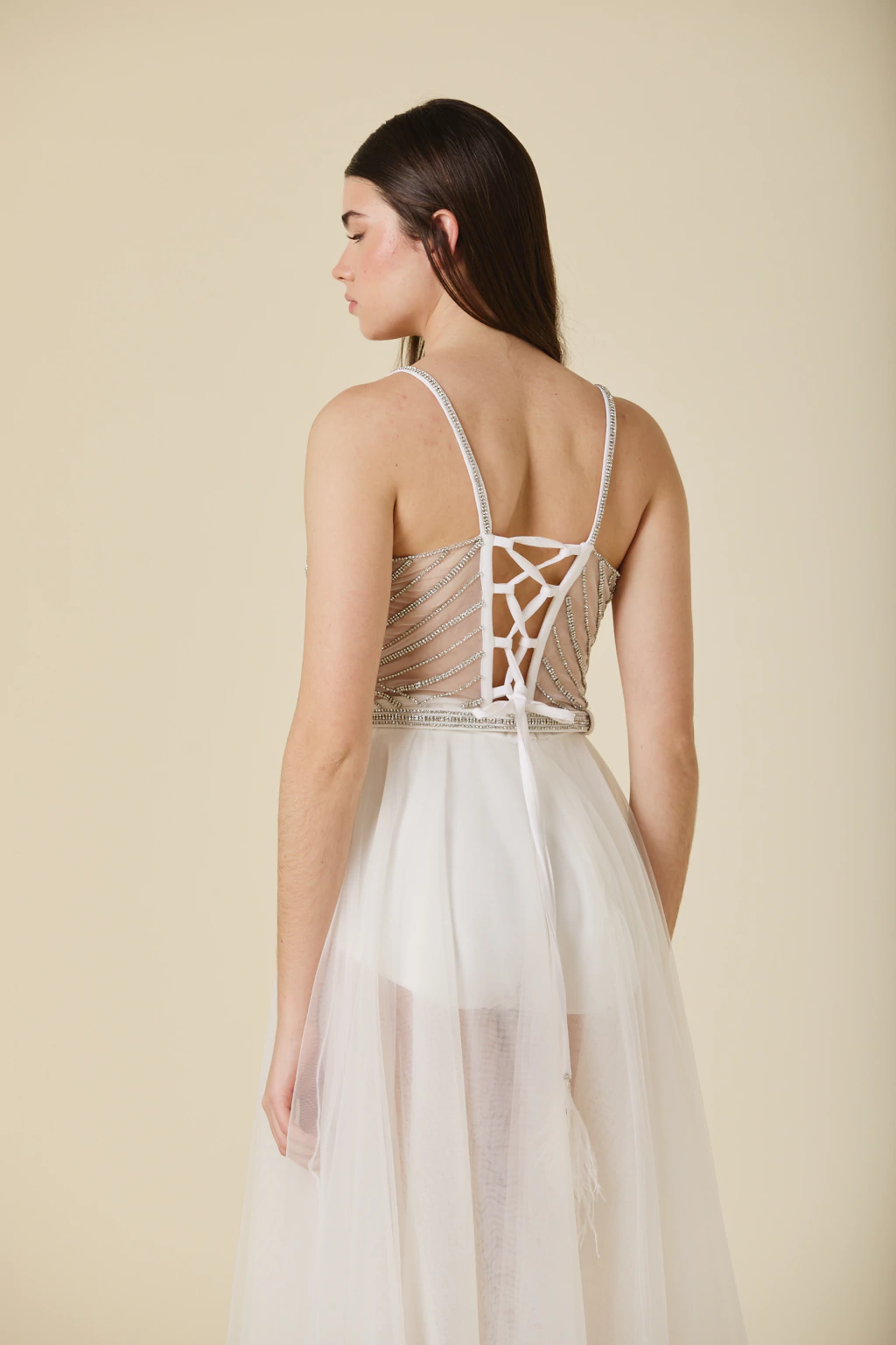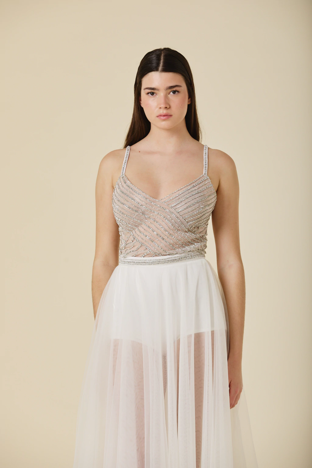 Brillo sutil, impacto asegurado. Este top de tul bordado se destaca por su trabajo artesanal de lentejuelas en diagonales, realzando el escote con líneas que dibujan la figura. El detalle de espalda en crepe aporta estructura, y el pequeño recorte frontal insinúa con delicadeza. Una prenda ideal para elevar conjuntos de noche o eventos especiales, con un equilibrio justo entre romanticismo y diseño contemporáneo.