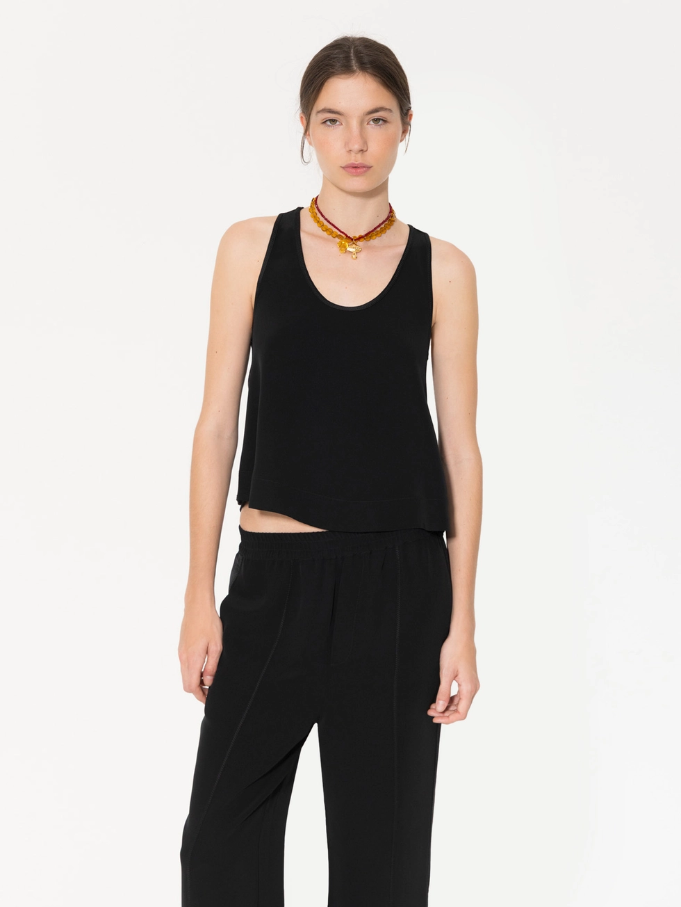 Top Cairo confeccionado en satín doble, de línea A y sin mangas. En los laterales incluye piezas de tela base con broches al tono, grabados con el logo de JCH.