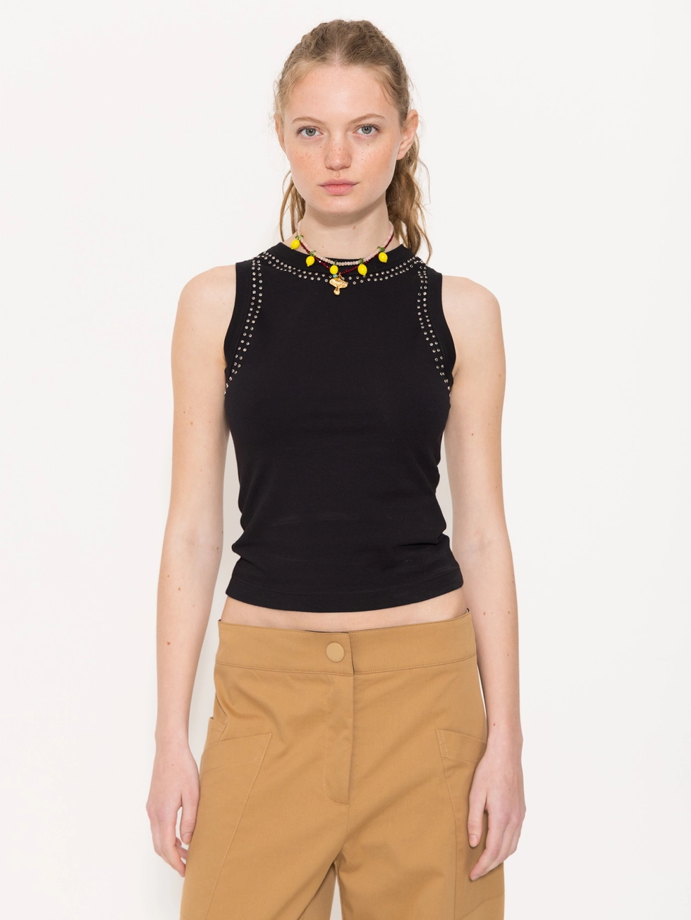 Top Chloe sin mangas, de fit al cuerpo. Lleva apliques hotfix alrededor del cuello.