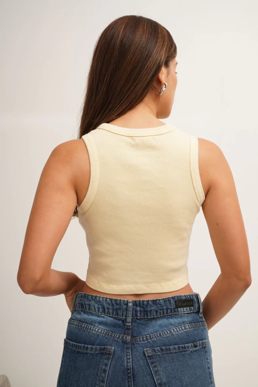 Top corto al cuerpo, sin mangas. Con escote redondo y collaretas anchas. Confeccionado en morley de algodón, con teñido diferencial y aspecto vintage con textura suave y elasticidad natural. Claudia usa talle S.