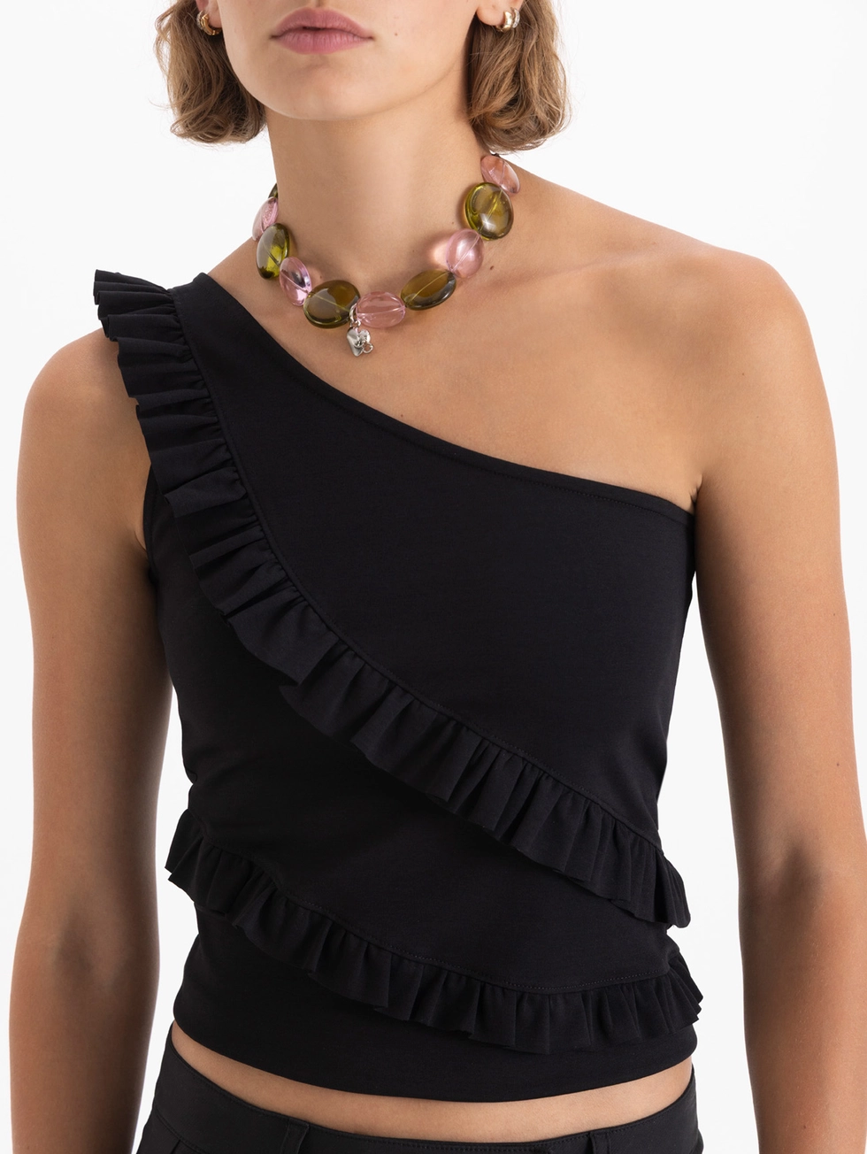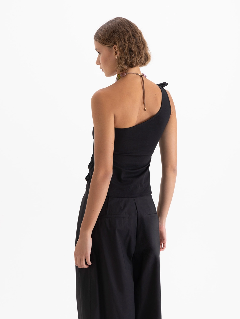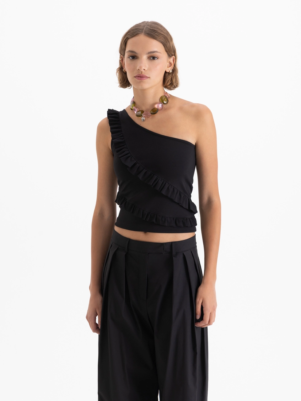 Top Eve confeccionado en tela de punto lisa, con un solo hombro y lleva volados en el delantero.