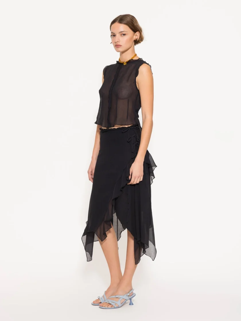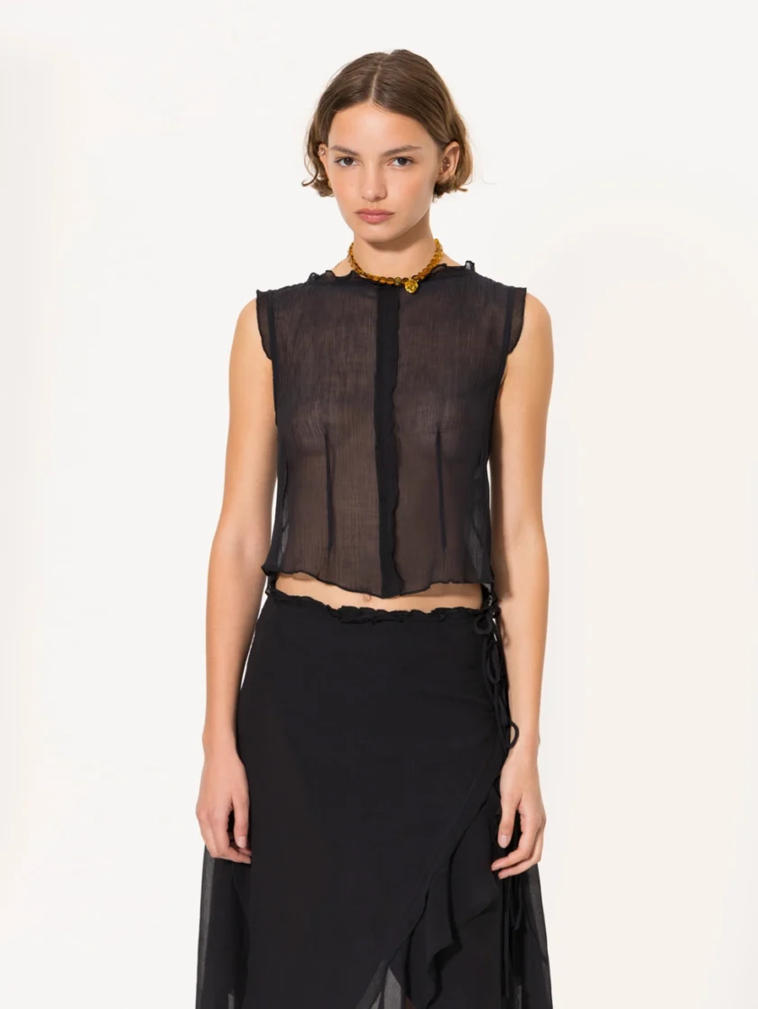 Top Funk de gasa de algodón corto hasta la cintura. Su acceso es mediante tiras de tela base que se anudan en la espalda, aportando un toque delicado y femenino. Una prenda liviana y versátil para looks frescos y sofisticados.