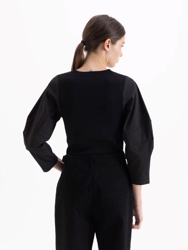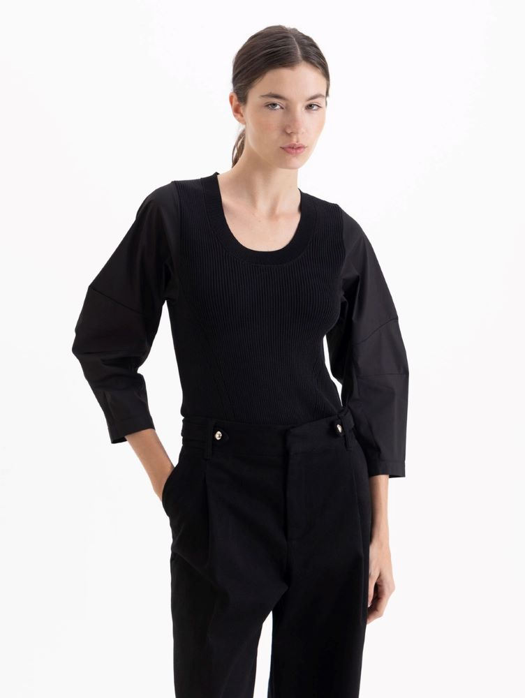 Top Helen tejido en hilado frío, de silueta al cuerpo que realza la figura. Combina mangas en tela plana con volumen, aportando contraste y un detalle femenino distintivo a la prenda.
