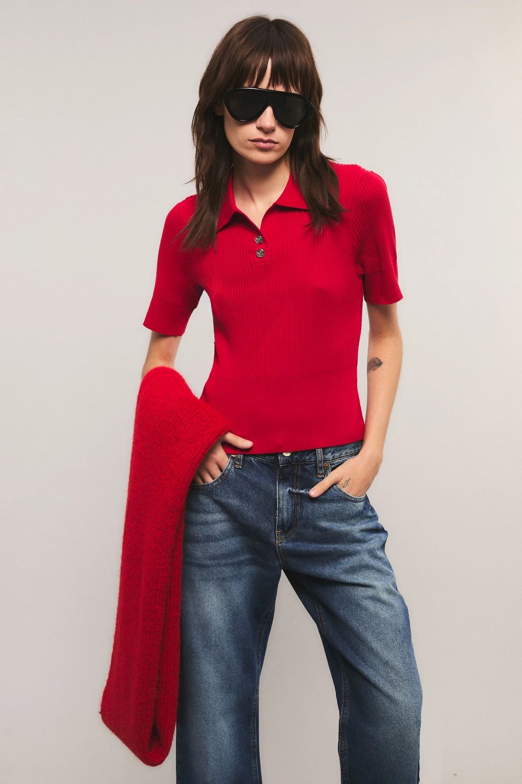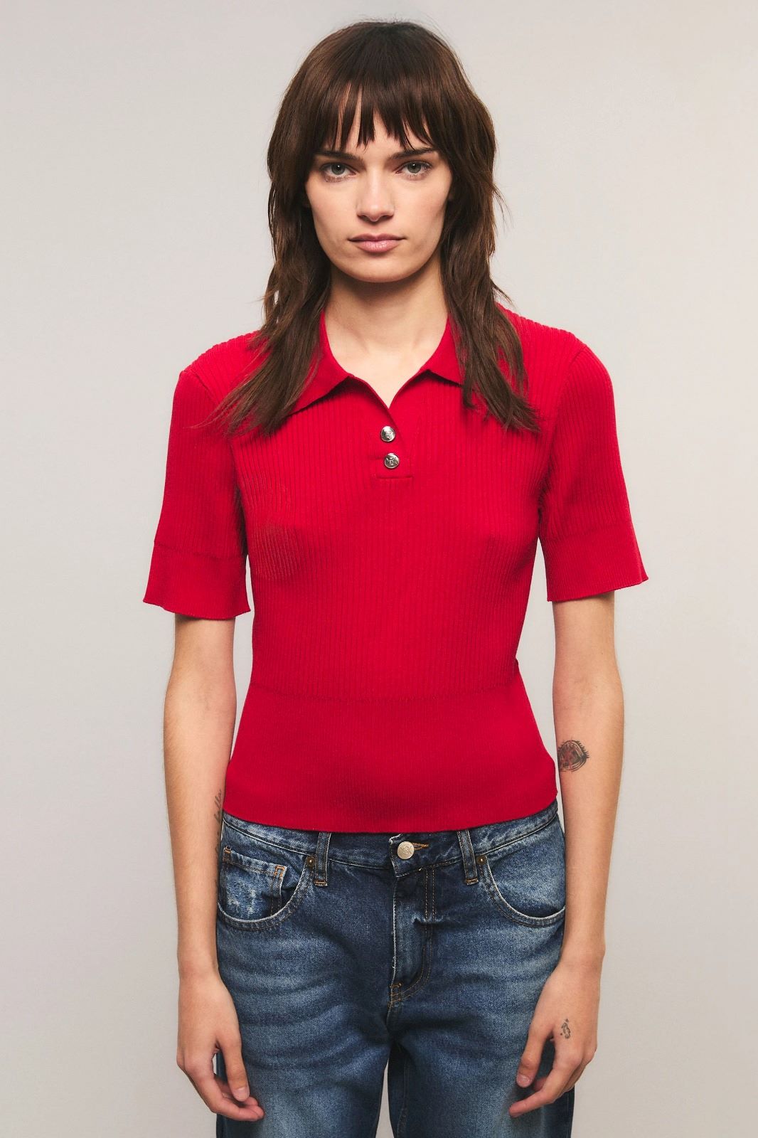 El top Hellraiser tiene un calce slim, con cuello redondo y mangas cortas. Está confeccionado en morley, con cuello en interlock y botones personalizados de la marca. Miranda está usando en la prenda superior un talle S, y en la prenda inferior un talle S/26. Sus medidas son: Altura 1.73 m. Busto 77 cm. Cintura 59cm. Cadera 85cm.