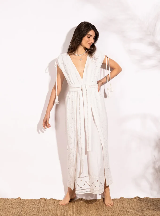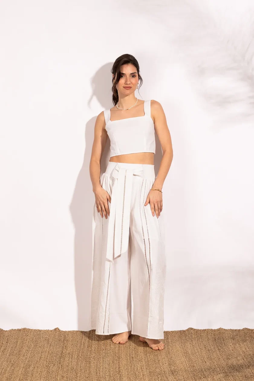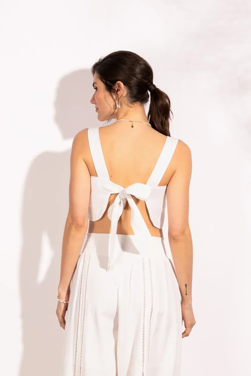 Top corto con espalda descubierta. Luce un gran festón bordado que crea un bonito lazo. Combina a la perfección con nuestra falda Ibera. Su composición es lino de algodón 100%, lo que le da un toque fresco y elegante.
