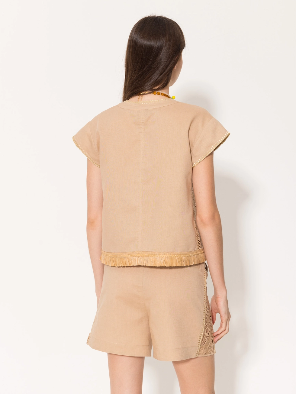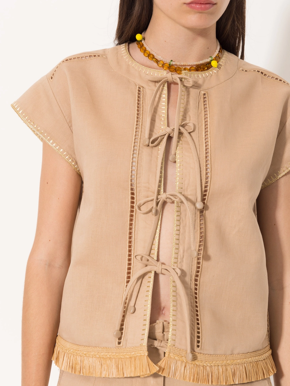 Top Madrid confeccionado en lino, largo a la cintura y sin mangas. El ruedo va terminado con flecos de rafia. Su acceso es a través de cordoncitos al tono que se anudan en el delantero. En ambos laterales lleva un bordado calado al tono.
