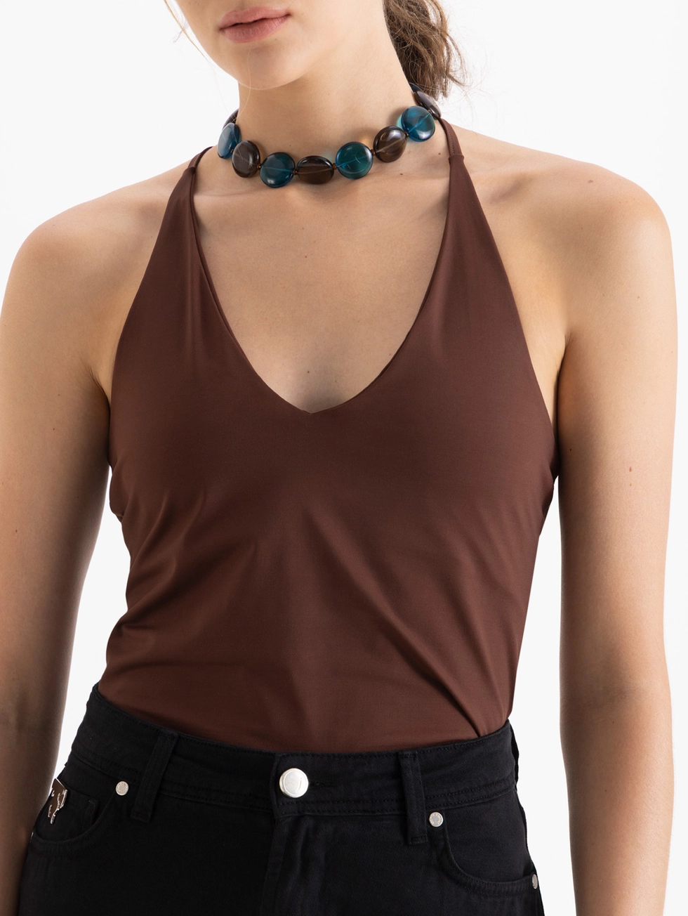 Top Margot confeccionado en tela de punto lisa, lleva breteles finitos que se unen en espalda. Es de calce al cuerpo.