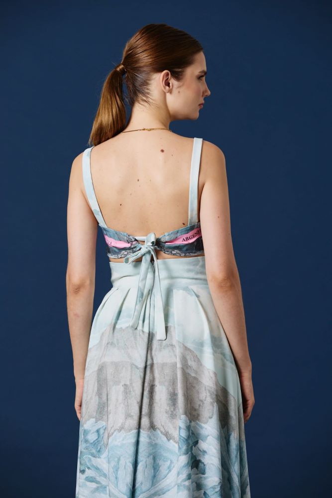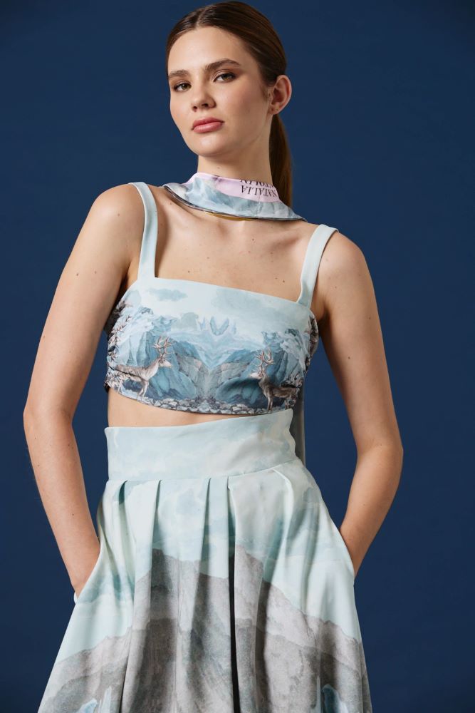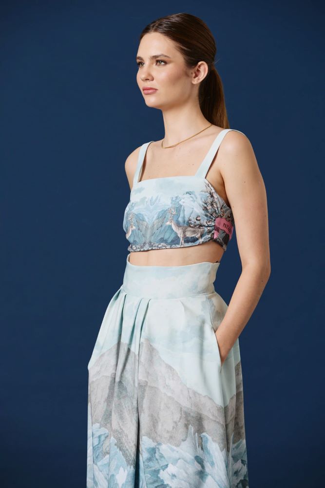 Este top pone en primer plano el paisaje estampado con un acabado limpio y minimalista, permitiendo que la ilustración sea la protagonista absoluta. El escote recto y los breteles anchos aportan estructura y equilibrio, logrando una silueta moderna, etérea y visualmente impactante. Una pieza versátil que funciona tanto como foco del look como base para combinaciones más elaboradas.