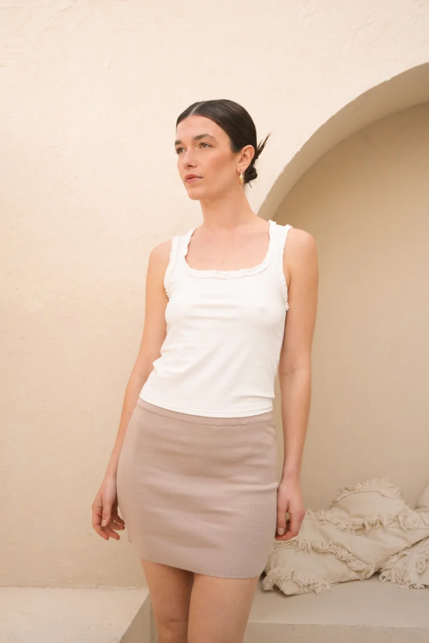 Top al cuerpo, con escote abierto redondeado, sin mangas y con detalle de volado en todo el recorrido de sisa y escote.