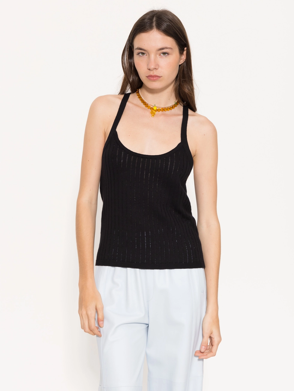 Top Salvador confeccionado en tejido de punto, de escote redondo y sin mangas. Lleva espalda cruzada y es largo a la cadera.