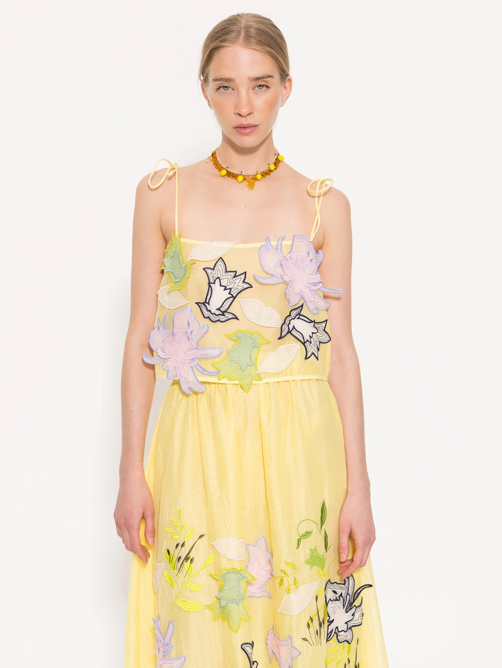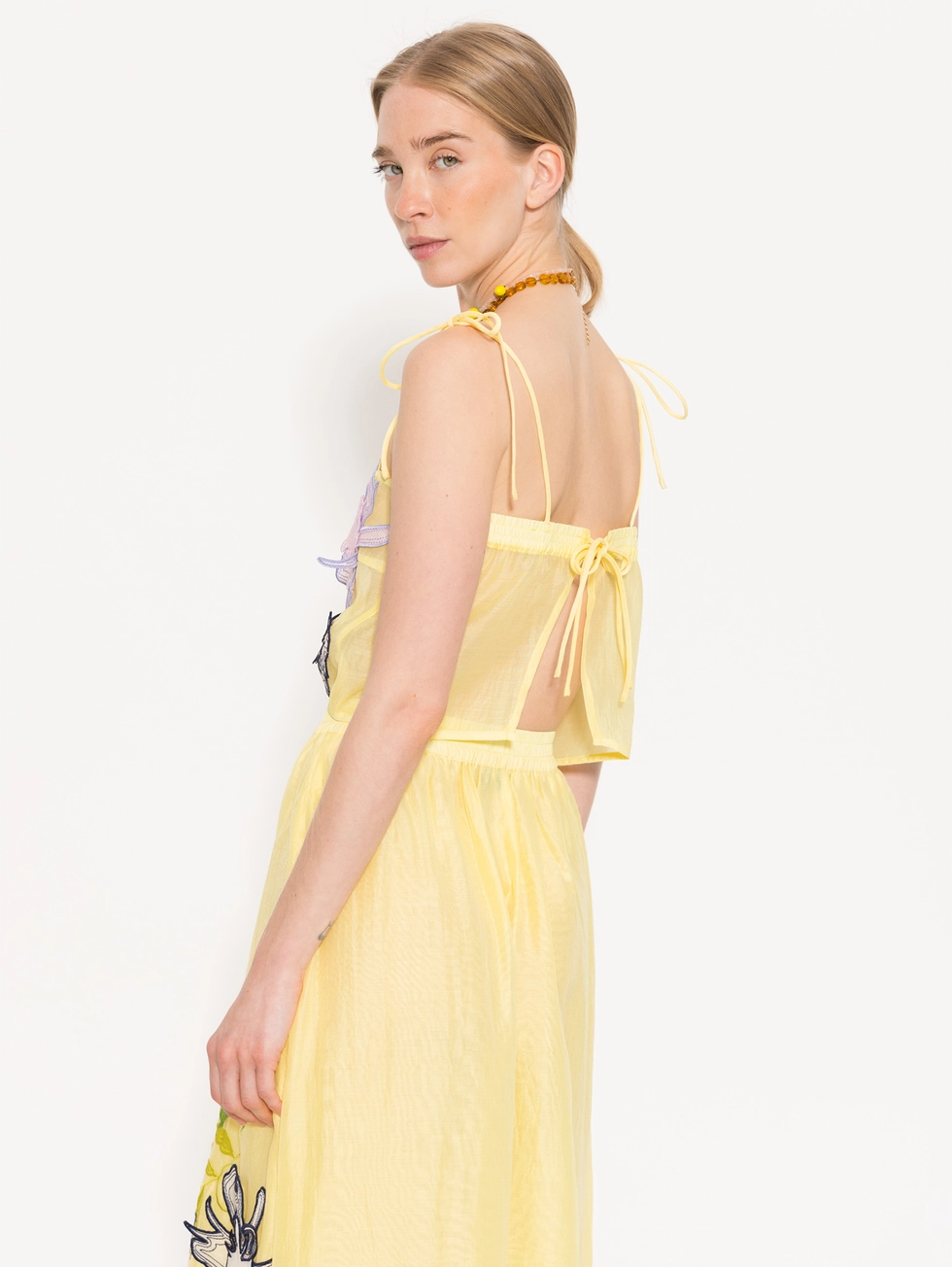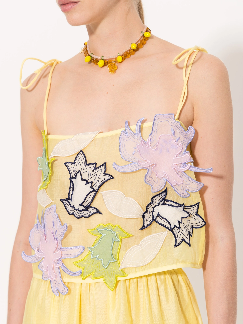 Top Tropez confeccionado en organza, corto hasta la cintura. Presenta breteles finitos de la misma tela y flores aplicadas a mano en distintos tonos sobre el delantero. La espalda es elastizada, con abertura central y tiras de tela base para anudar.