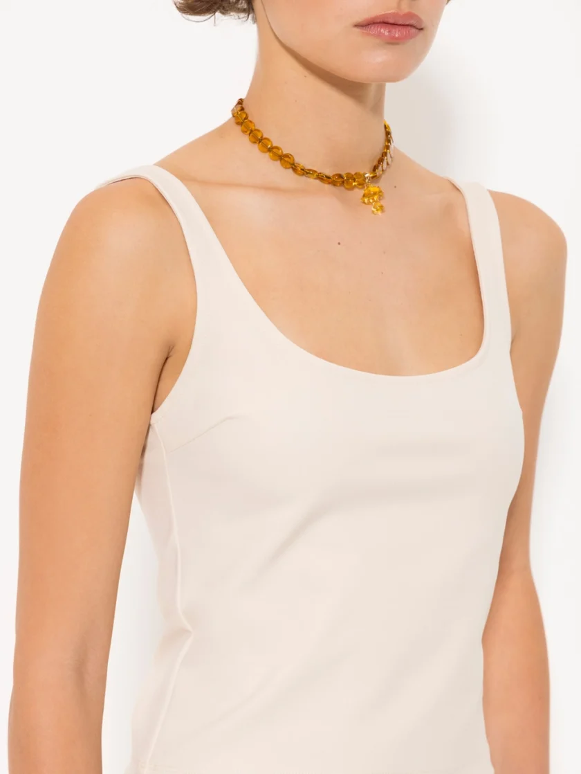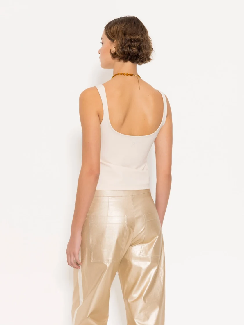 Top Verona confeccionado en tela tramada con escote redondeado profundo en delantero y espalda. Sin mangas y de largo a la primera cadera, es un diseño ajustado y femenino, ideal para terminar cualquier look.