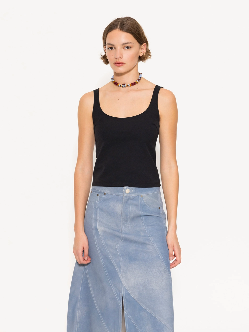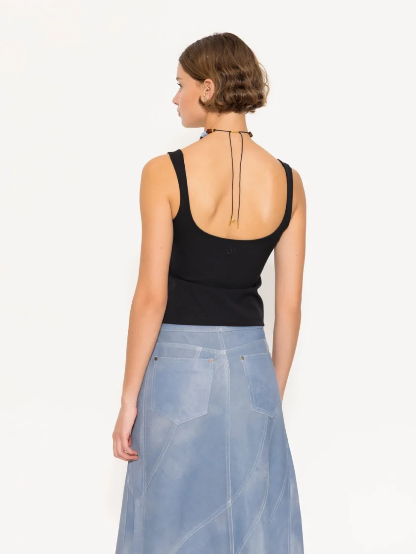 Top Verona confeccionado en tela tramada con escote redondeado profundo en delantero y espalda. Sin mangas y de largo a la primera cadera, es un diseño ajustado y femenino, ideal para terminar cualquier look.