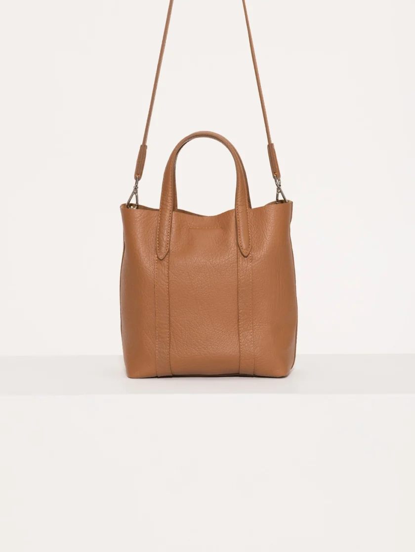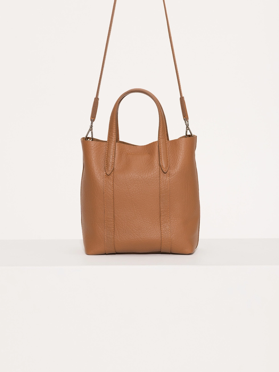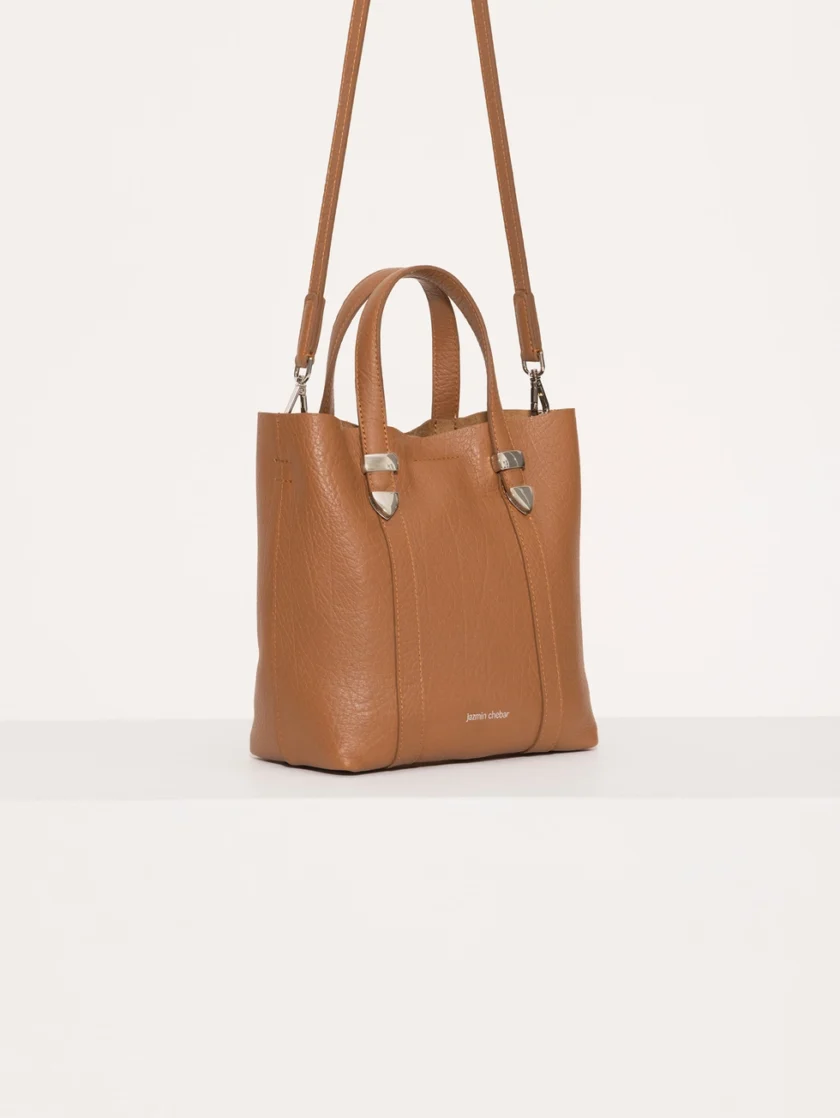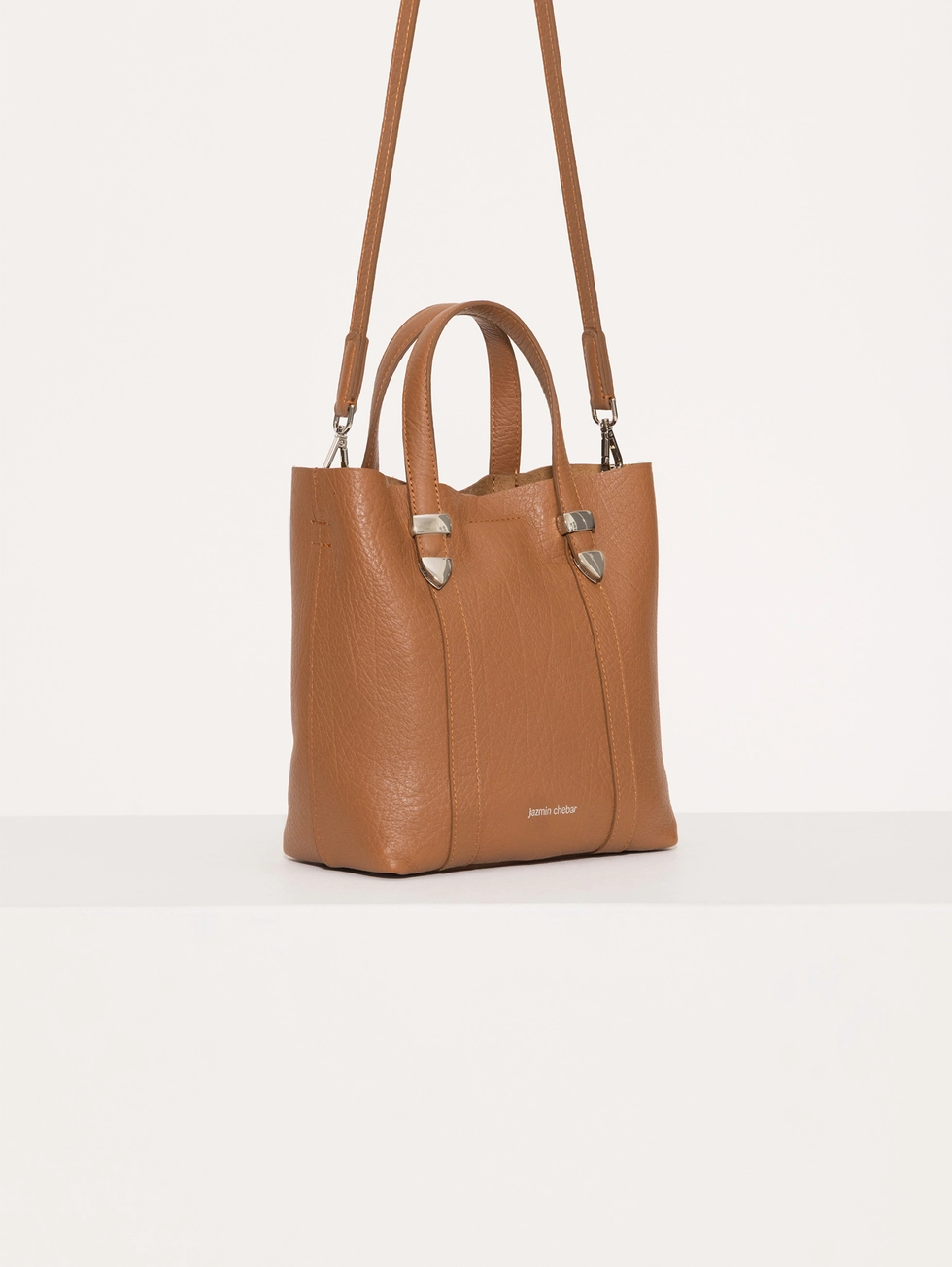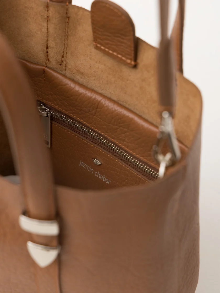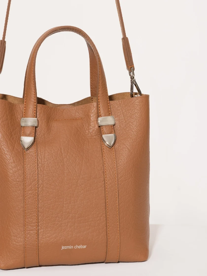Tote Icon West Small confeccionada íntegramente en cuero vacuno. Cuenta con manija y correa regulable, acceso con imán y bolsillo interno con cierre que brinda practicidad. Las punteras metálicas completan un diseño elegante y funcional, perfecto para el uso diario.