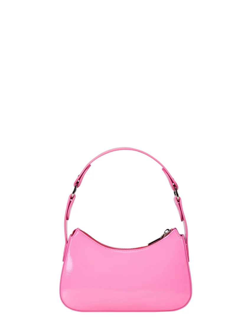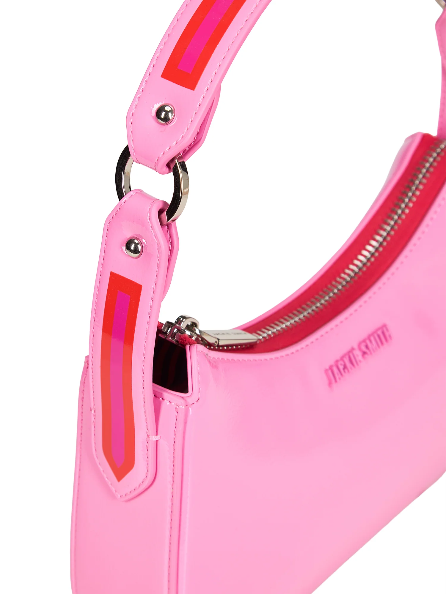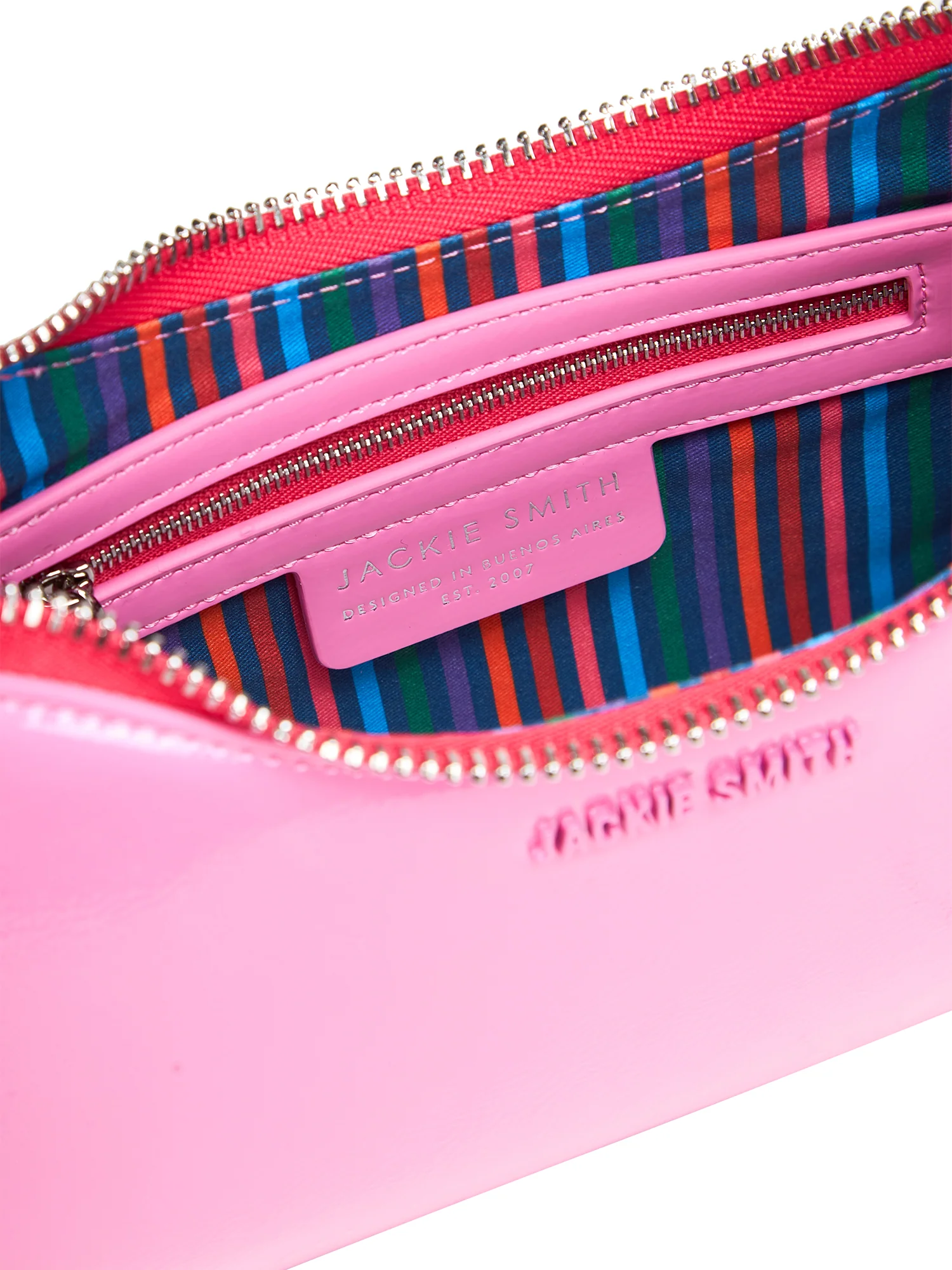 Este mini bag de líneas depuradas y silueta curva combina el acabado pulido del charol con acentos cromáticos que lo elevan. Su manija ancha y estructurada, con nuestras signature stripes estampadas en serigrafía, aporta un contraste visual inesperado que infunde una actitud contemporánea. Compacto aunque expresivo, su diseño fue pensado para acompañarte tanto en salidas nocturnas como en looks diurnos de alto impacto. El interior forrado, el cierre metálico níquel y la estructura firme construyen una pieza que se mueve con soltura entre la función y el gesto.