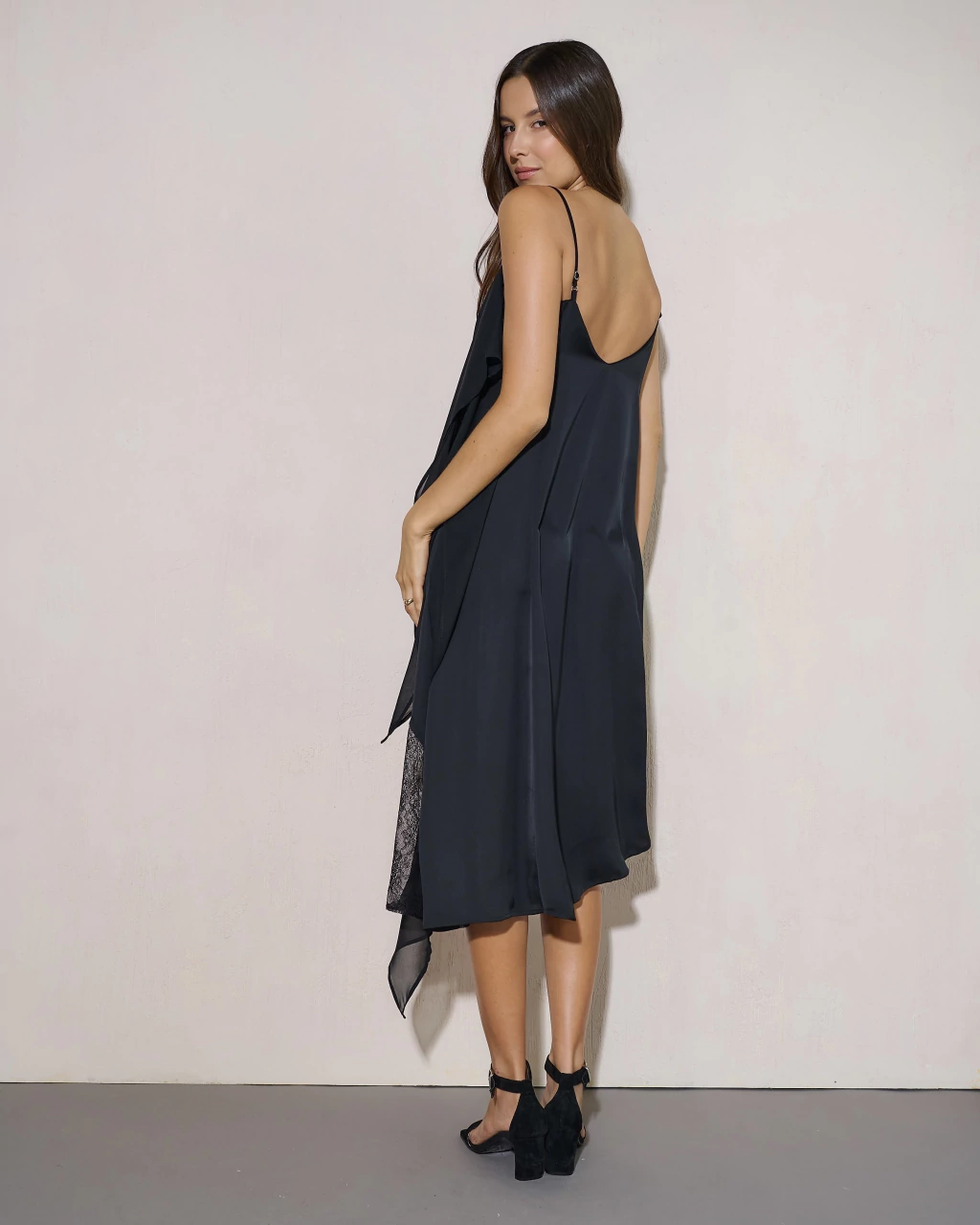 Vestido midi, suelto, asimétrico de sedita, gasa y encaje. Con recortes en encaje y volados y capas en hasa. Posee breteles con reguladores.