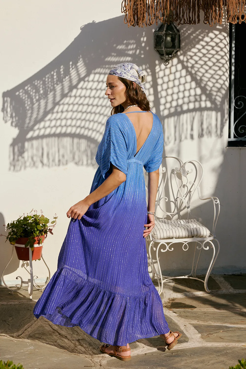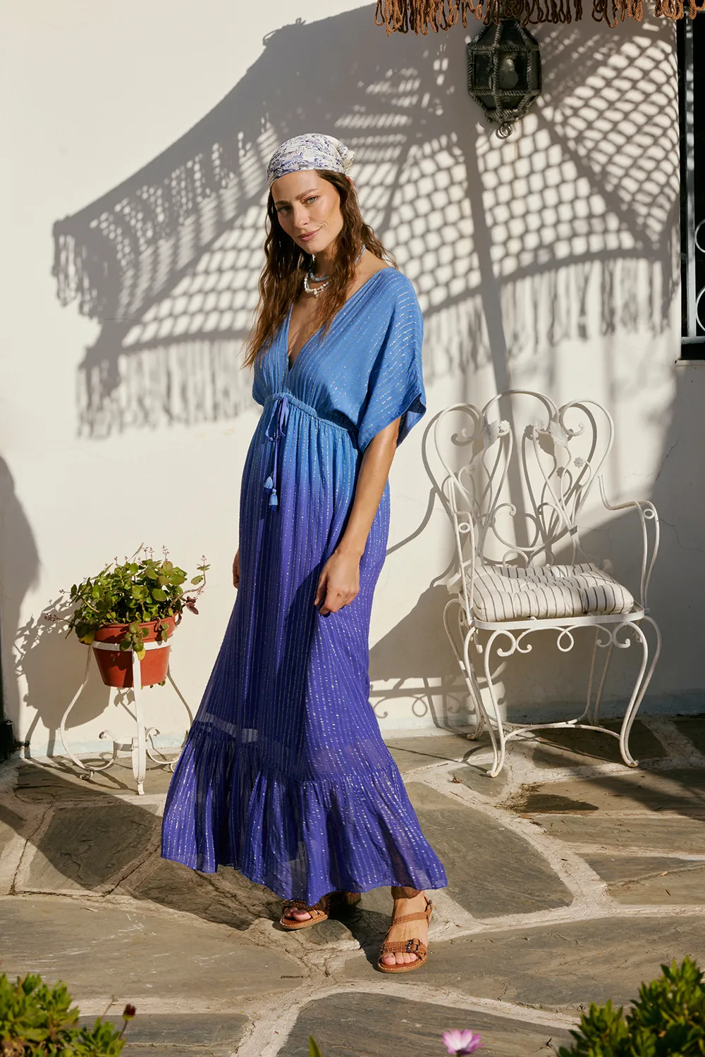 Vestido largo, de corte holgado, manga caída y ajuste en cintura por medio de tira. De escote en V y terminación con un delicado volado en su parte inferior lo que le da mayor ligereza y movimiento.