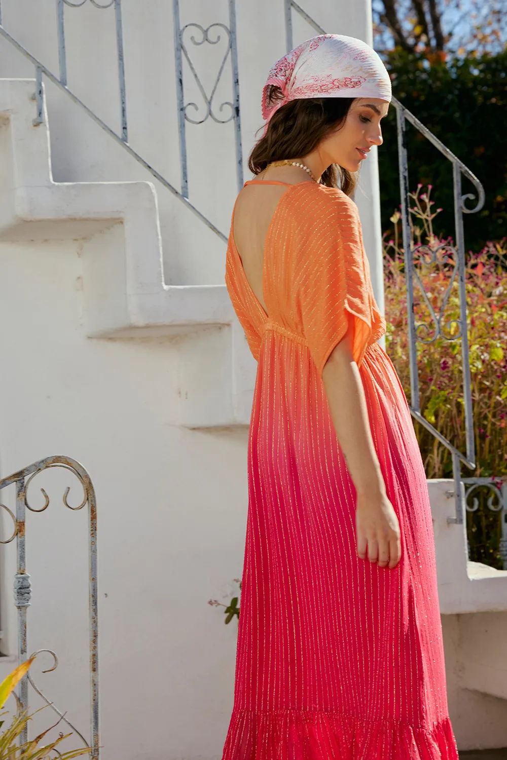 Vestido largo, de corte holgado, manga caída y ajuste en cintura por medio de tira. De escote en V y terminación con un delicado volado en su parte inferior lo que le da mayor ligereza y movimiento.