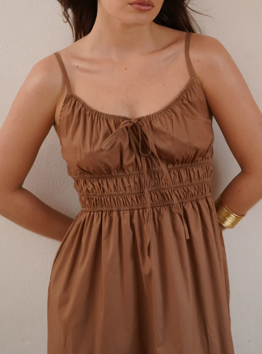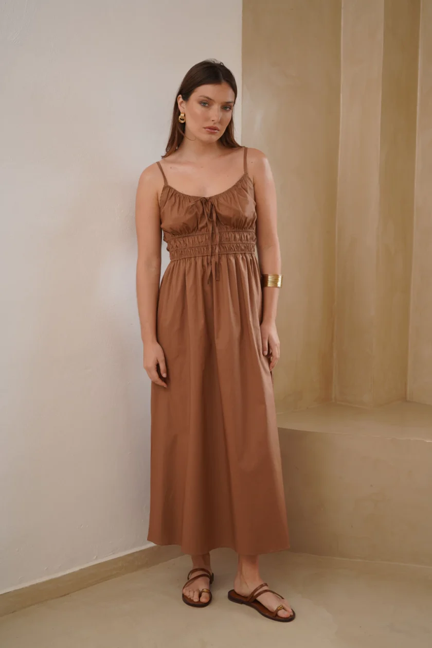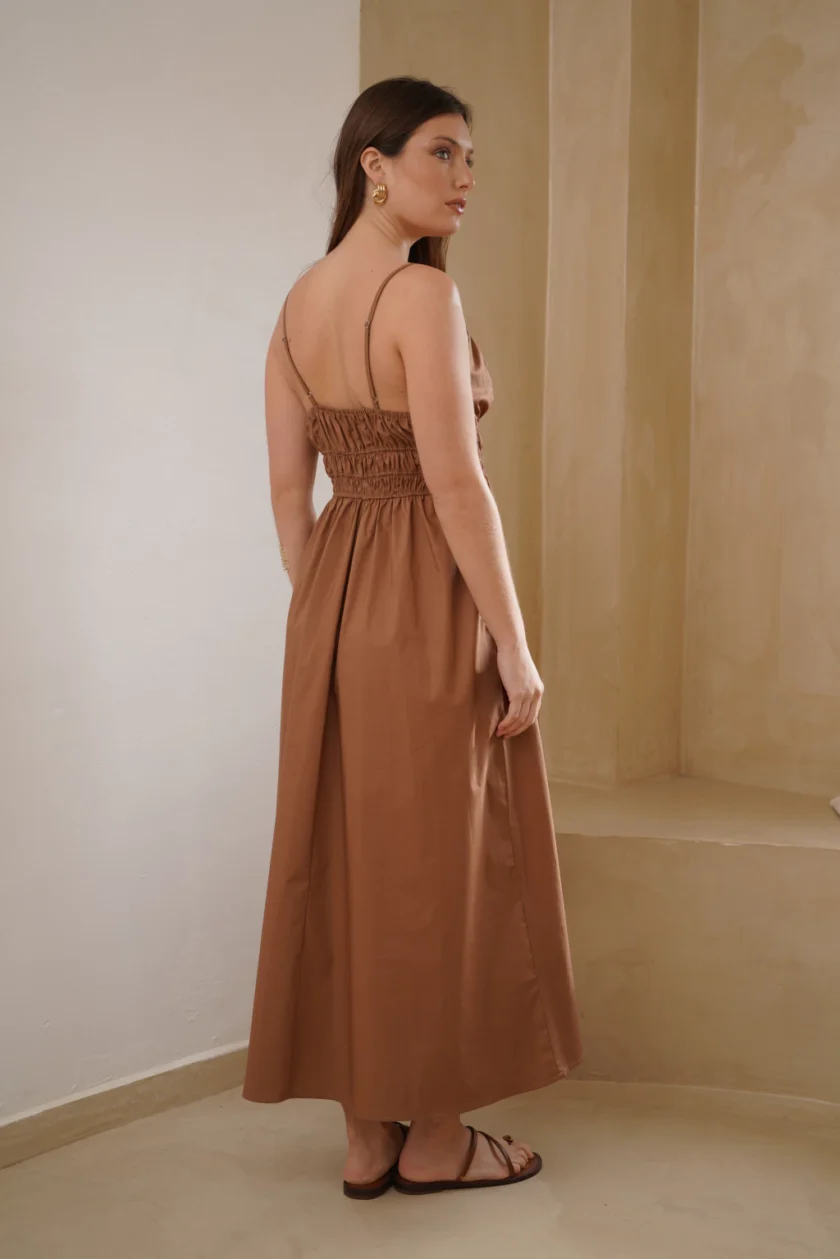 Vestido suelto, largo hasta los tobillos, con frunces en el bajo busto y escote y breteles con aro y regulador.