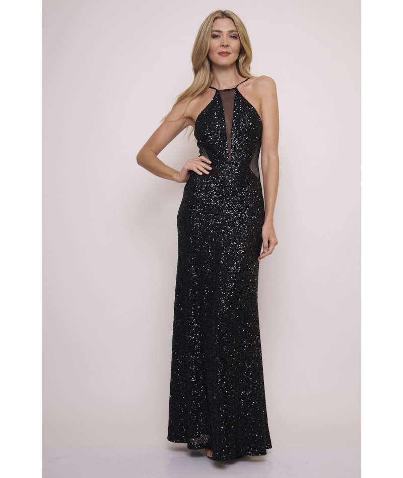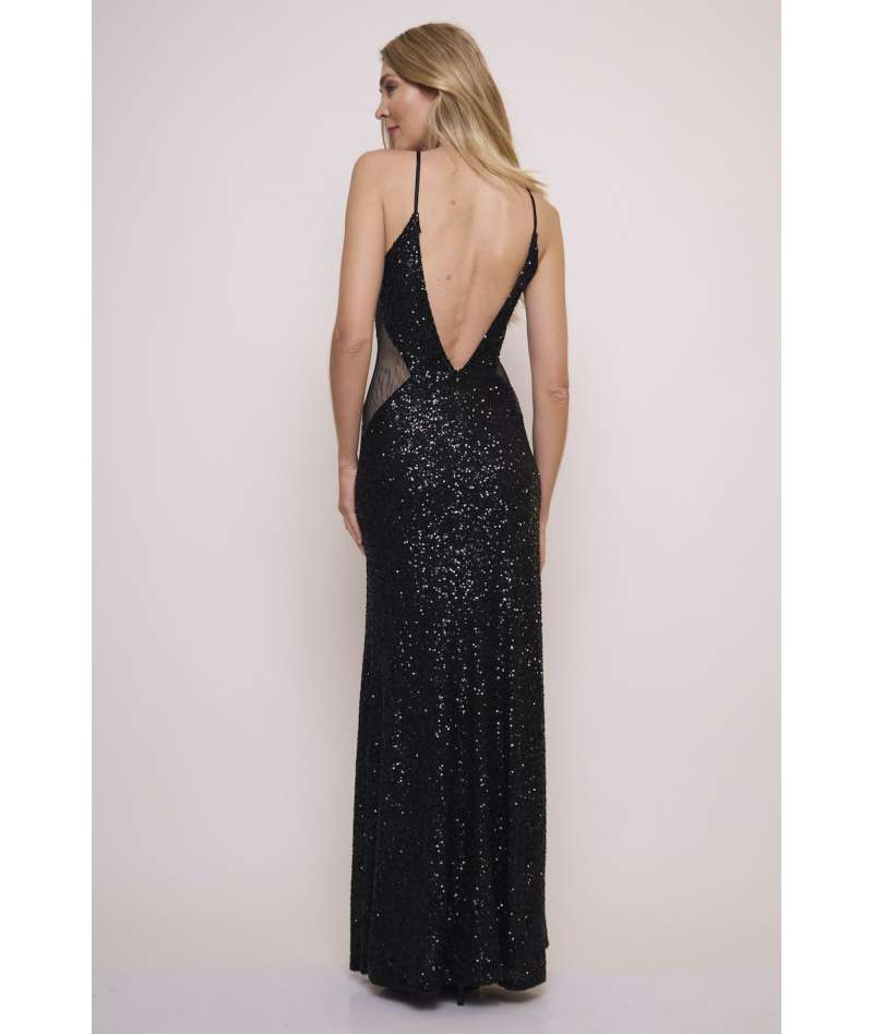 vestido largo de paillette con cut out en los costados y escote, espalda descubierta
