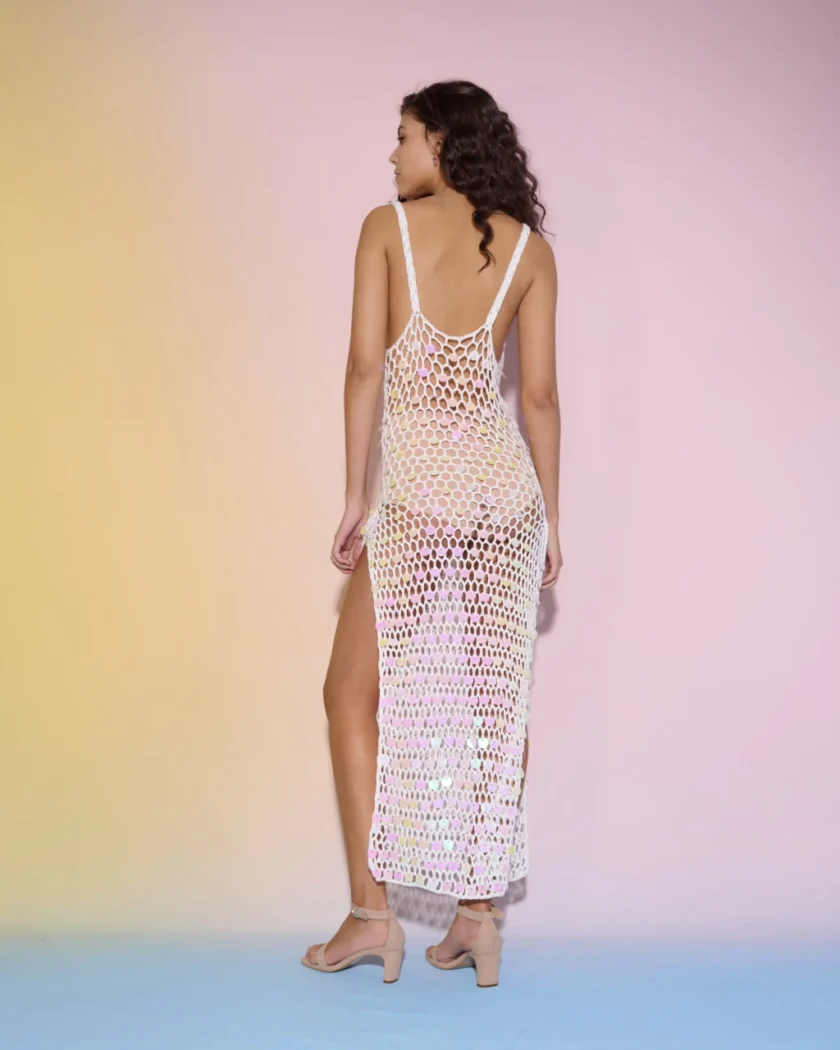 Vestido largo tejido con diseño calado, escote en V y breteles finos. Presenta tajos laterales y detalles de lentejuelones bordados que realzan su confección.