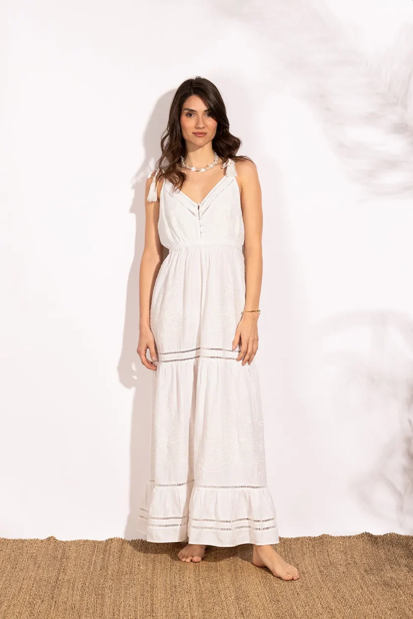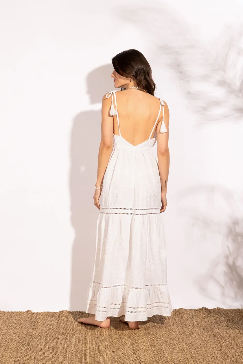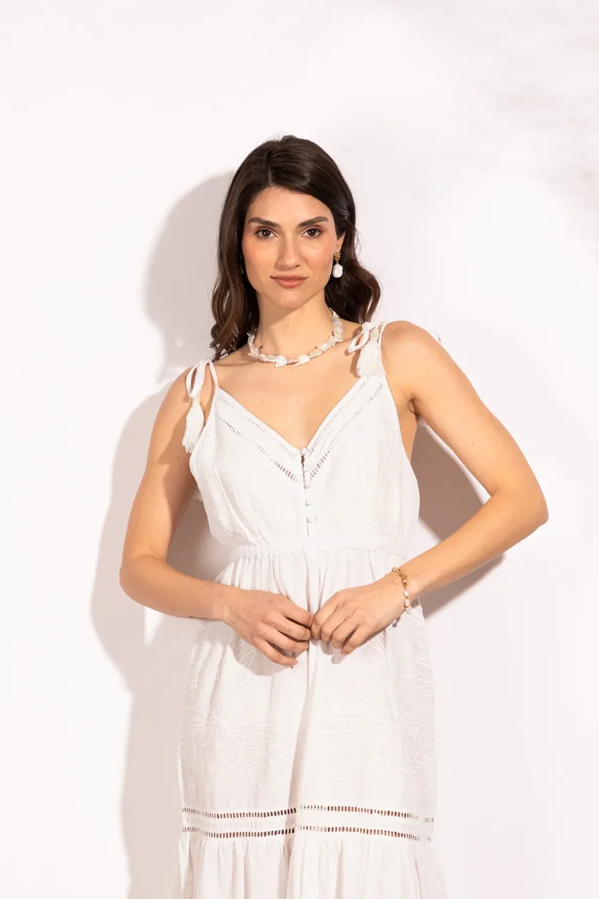 Vestido de lino bordado con diseños únicos de calados y bordados. Con botones forrados en la parte delantera y lazos con borlas en los hombros, el vestido de lino bordado Esteros se puede ajustar para una máxima comodidad.