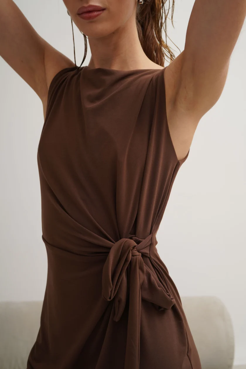 Vestido corto y al cuerpo, sin mangas y con detalle de lazo cruzado en el frente para ajustar.