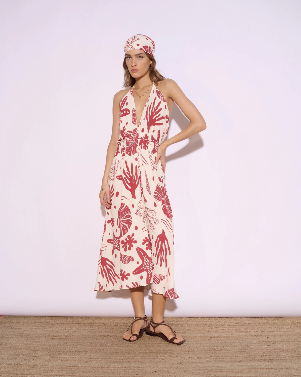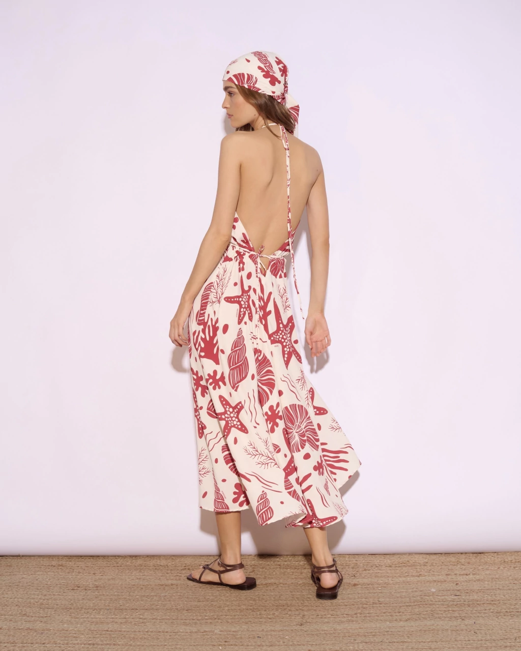 Vestido largo con escote profundo en V y espalda descubierta, confeccionado en tejido liviano con estampa exclusiva de Shibinda. Una prenda elegante y distintiva que resalta por su diseño único.