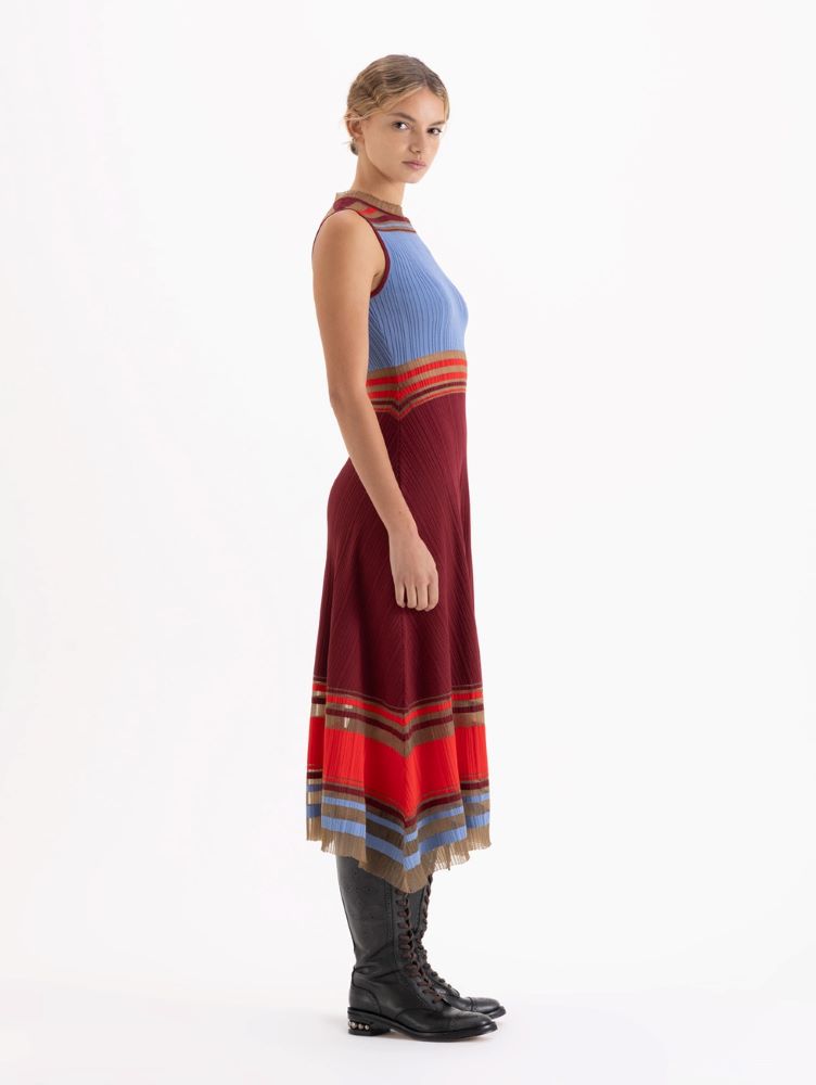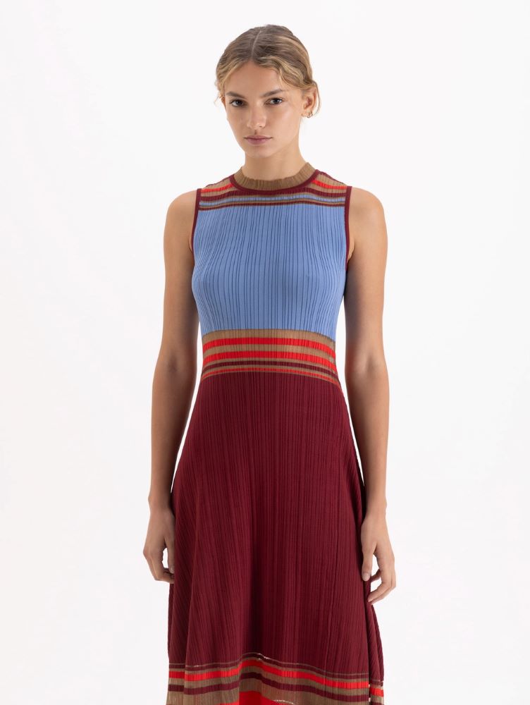 Vestido Japón midi de punto sin mangas, diseñado con una sofisticada estructura plisada que aporta relieve y movimiento a la prenda. Se destaca por su juego de rayas horizontales en escote. Su falda de línea evasé con terminación irregular y sutiles transparencias estiliza la silueta.