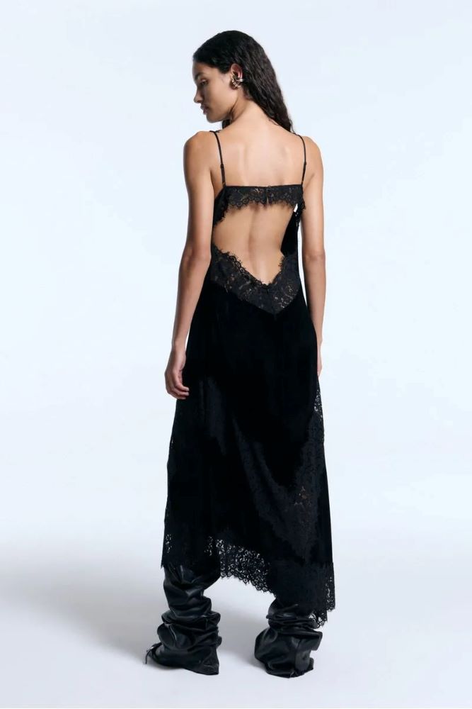 Vestido lencero combinado con terciopelo de seda y puntilla de encaje. Posee escote V profundo con boton en frente. Escote de espalda bajo con detalle de puntilla. Ideal para un look de fiesta o cocktail. Se sugiere también combinar con jeans y botas para un look más relajado y canchero.