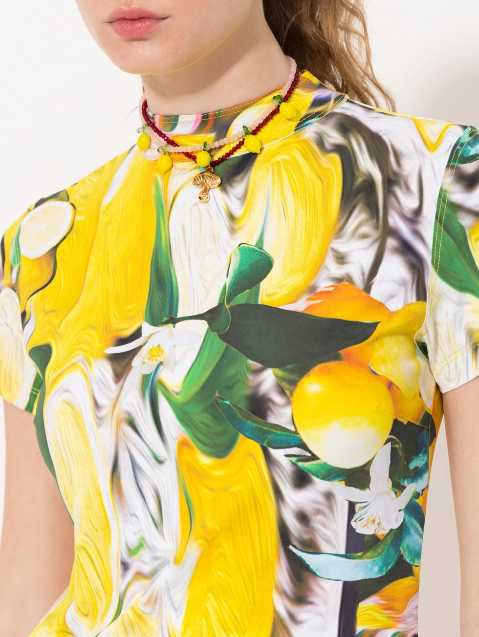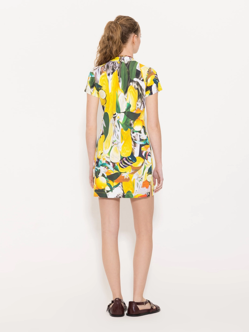 Vestido Lemon confeccionado en lycra estampada, con cuello media polera y terminaciones al corte en los ruedos. Su acceso es mediante cierre metálico en espalda.