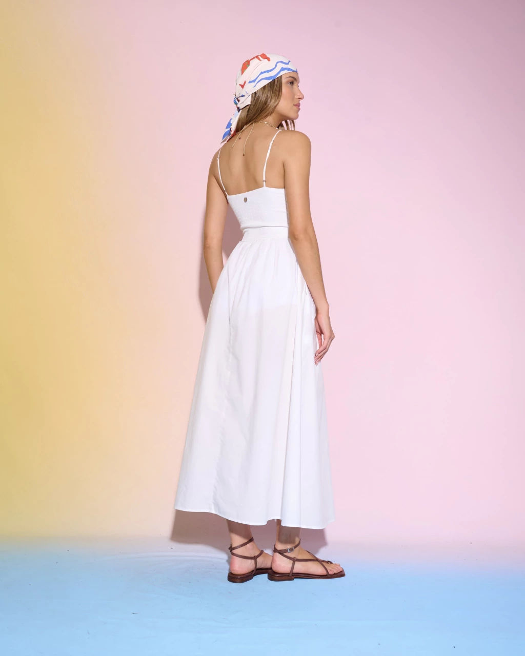Vestido midi que combina dos géneros con texturas contrastantes: bustier en algodón bambula texturado y falda en poplin de algodón con tajo frontal. El top se encuentra forrado y cuenta con short interno de microfibra. Breteles finos regulables y bolsillos laterales aportan comodidad y funcionalidad. (La producción es 10 cm más larga que la mostrada en fotos).
