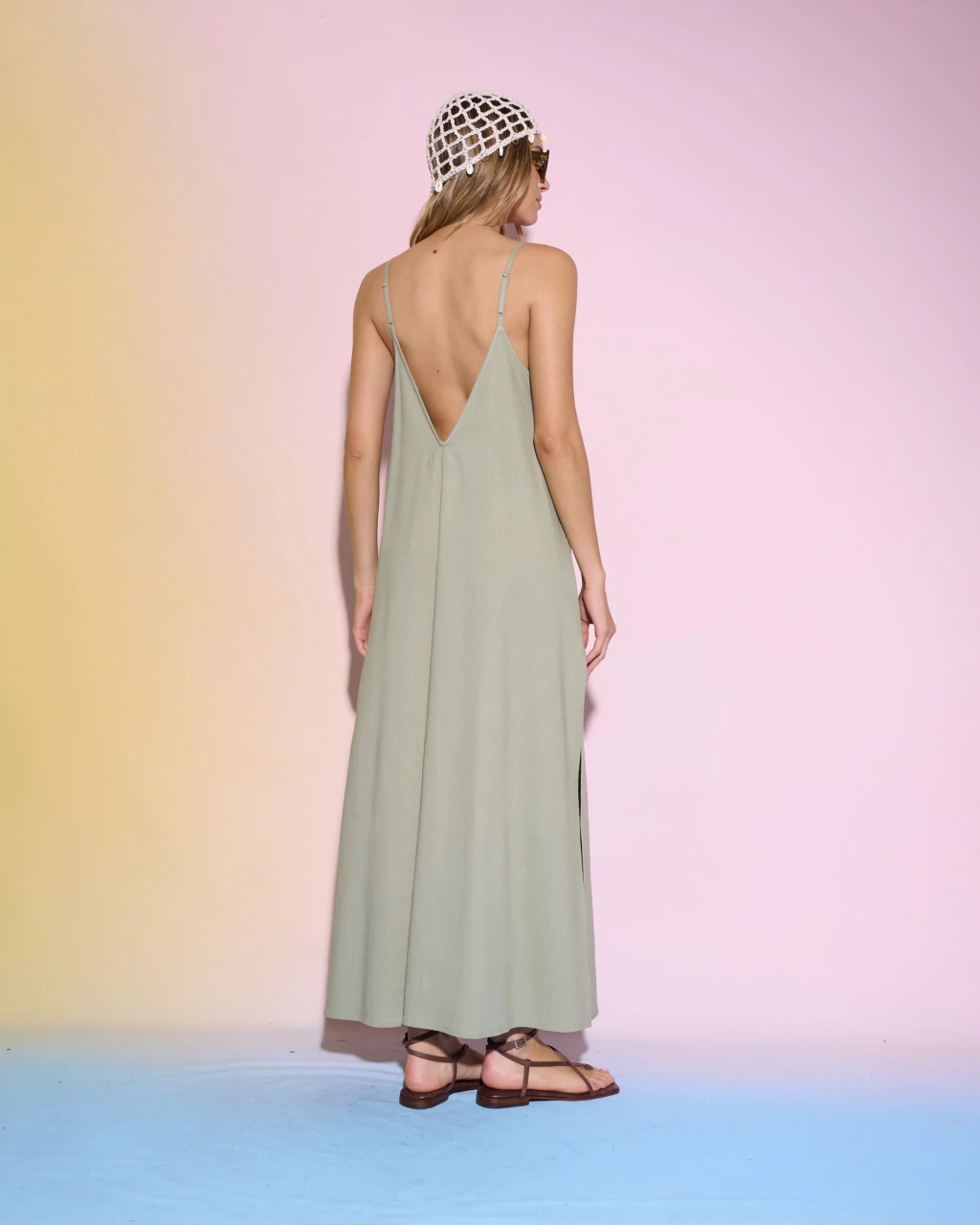 Vestido largo confeccionado en lino, con escote profundo tanto en delantero como en espalda. Presenta tiras regulables para un ajuste personalizado y tajos laterales que aportan movimiento.